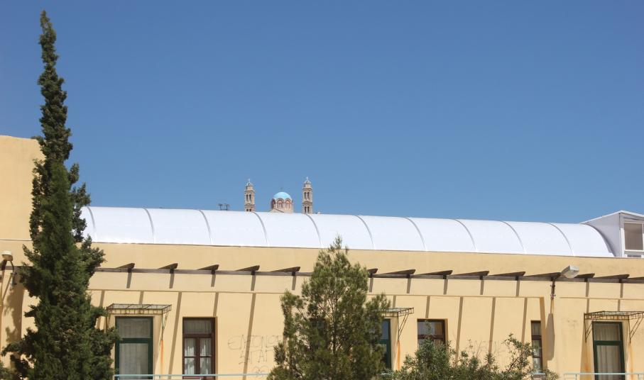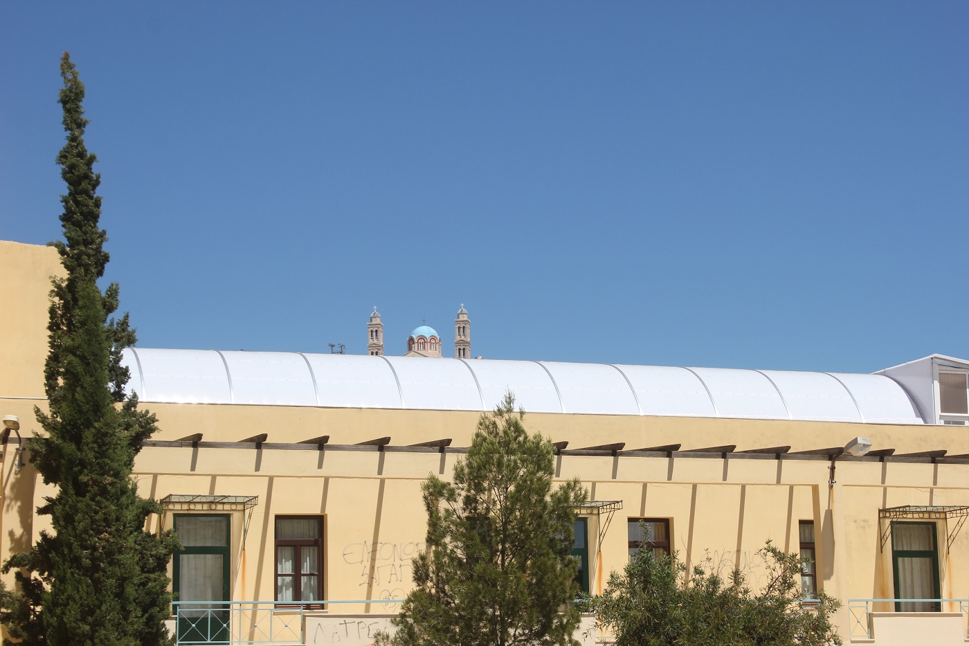 Tο νέο υλικό της οροφής του θόλου έχει ήδη τοποθετηθεί, με τις εργασίες να προωθήθηκαν από τον ανάδοχο του έργου εντός των ημερών του Πάσχα, προκειμένου να μην χαθούν περισσότερες διδακτικές ώρες τη φετινή χρονιά, η οποία “στιγματίστηκε” από τις αποφάσεις Δημάρχου για παύση λειτουργίας των Γυμνασίων σε συγκεκριμένες ημερομηνίες, κατά τις οποίες οι άνεμοι ήταν ιδιαιτέρως ισχυροί και ο κίνδυνος αποκόλλησης των πάνελ ήταν ορατός.