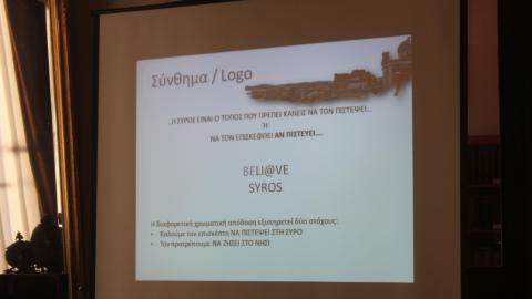 Στις προτάσεις που κατέθεσε προς τον Δήμο, ο κ. Μαρτάκης κρίνει επιβεβλημένη και την αλλαγή του logo. Ειδικότερα, επισημαίνει πως το σημερινό logo “Moore than an island” πρέπει να διατηρηθεί ως επεξηγηματικό, ενώ σύμφωνα με το σκεπτικό που ανέλυσε, η Σύρος μπορεί να αποκτήσει το BELI@VE SYROS. Πιο αναλυτικά στην παρουσίασή του είπε τα εξής: “Περιγραφή του σκεπτικού: Με στόχο την ανάδειξη της Σύρου ως τόπου, που συνδυάζει το απόλυτα εναρμονισμένο θρησκευτικό στοιχείο, που αποτελεί τόπο, όχι μόνο διακοπών, αλλά ακόμα και διαμονής και που διαθέτει πληθώρα ενδιαφερόντων που καλύπτουν όλο το φάσμα των αναζητήσεων κάθε επισκέπτη” και με άξονα τη δημιουργία του κινήτρου της περιέργειας (αναφορικά με τα όσα ο προορισμός διαθέτει) και της πίστης (σε όσα υπόσχεται στον υποψήφιο επισκέπτη), το νησί πρέπει να δώσει έμφαση στα ποιοτικά χαρακτηριστικά του και στα στοιχεία της ασφάλειας και της φιλικότητας. Για όλα τα παραπάνω, ο ίδιος επανέλαβε την πρότασή του για το logo: BELI@VE SYROS.