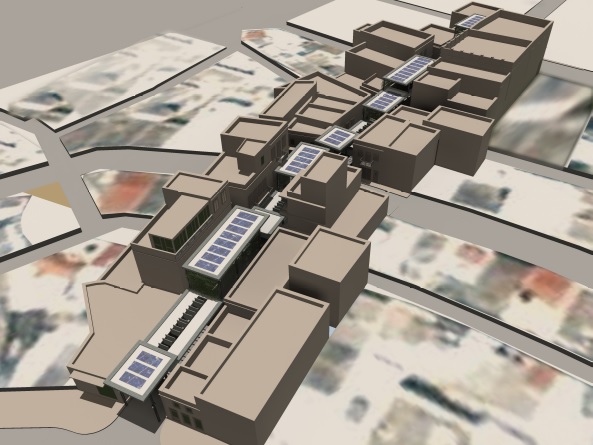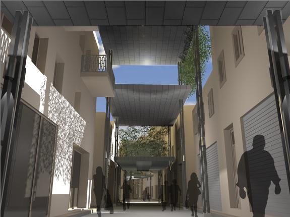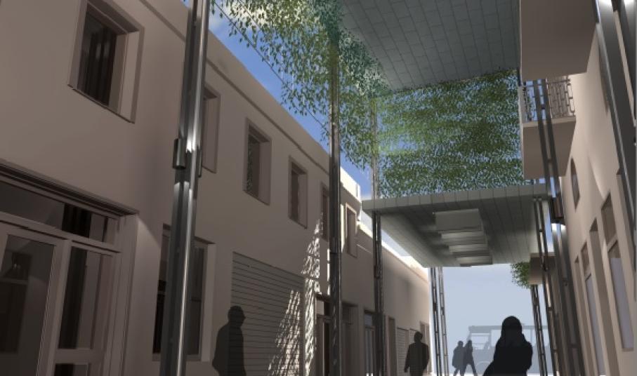 α. Το στέγαστρο θα αποτελείται από 14 επίπεδα στέγαστρα τα οποία τοποθετούνται σε διάφορα ύψη και επίπεδα κατά μήκος της οδού, προσαρμοζόμενα κάθε φορά στις απαιτήσεις των όψεων των κτιρίων. β. Στηρίζεται σε απλές διατομές μορφοσιδήρου UPN μικρής διατομής. γ. Η κατασκευή είναι αυτοφερόμενη και σε κανένα σημείο δεν ακουμπά στα κτίρια. δ. Καλύπτεται στην οροφή και το περιθώριό του με φύλλα τιτανιούχου ψευδαργύρου (διακριτική και εξευγενισμένη υπόμνηση των τσίγκινων επίτοιχων στεγάστρων). ε. Στα 4 χαμηλότερα τμήματα του στεγάστρου προβλέπεται επιμήκης παραλληλόγραμμος φεγγίτης για τον επαρκή φωτισμό της οδού, ο οποίος σκιάζεται από μεγάλες κατακόρυφες περσίδες. στ. Σε διάφορα σημεία προβλέπεται αναρτημένη φύτευση, η οποία φιλτράρει το φως δημιουργώντας δροσερή ατμόσφαιρα και ανάλαφρο φωτισμό, ενώ ταυτόχρονα προσθέτει μικροκλίμα πρασίνου στην περιοχή. ζ. Στο βόρειο άκρο επί της οδού Χίου και πλ. Μιαούλη το πρώτο στέγαστρο είναι μια περσιδωτή κατασκευή, η οποία έχει σαν στόχο να σηματοδοτήσει την αρχή του στεγάστρου και να δημιουργήσει μια περιοχή μερικής σκίασης στην αρχή της αγοράς , για την ομαλή οπτική μετάβαση από το φως στη σκιά. η. Στην οδό Πρωίου το στέγαστρο διακόπτεται. Τα δύο τμήματα του στεγάστρου συναντιόνται και σε κάποιο ύψος το ένα προσεγγίζει το άλλο, χωρίς όμως να το φτάνει εντελώς. θ. Τέλος, στα υψηλότερα στέγαστρα που έχουν επαρκή ηλιασμό προβλέπονται φωτοβολταϊκά πάνελ για τον φωτισμό του ίδιου του στεγάστρου και όχι μόνο.