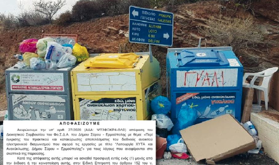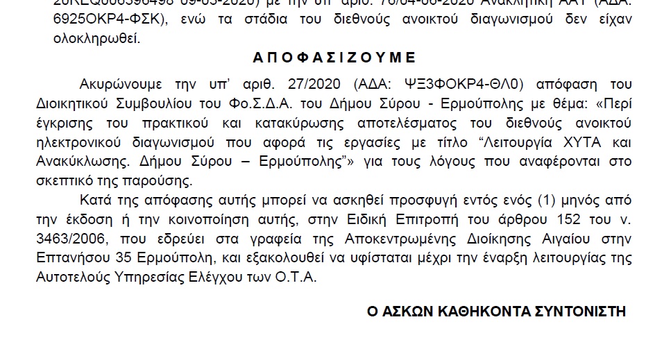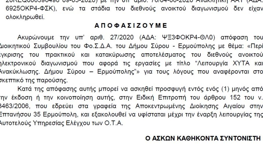 Συγκεκριμένα, η ακυρωτική απόφαση του διαγωνισμού από την ΑΔΑ έγινε γνωστή μέσω της μακροσκελέστατης ανακοίνωσης της παράταξης “Η Σύρος που αξίζουμε”, στο περιεχόμενο της οποίας – μεταξύ άλλων – αναφέρονται τα ακόλουθα: “Θα ακουστεί ειρωνικό, ίσως και σαρκαστικό, αλλά μετά λύπης μας διαπιστώσαμε χθες την έκδοση ακυρωτικής απόφασης του Συντονιστή της Α.Δ. Αιγαίου για την υπ’ αρ. 27/2020 απόφαση του διοικητικού συμβουλίου του Φο.Δ.Σ.Α. που ελήφθη στις 15 Ιουλίου, με την οποία είχε εγκριθεί το από 13/7/2020 πρακτικό της Επιτροπής Διενέργειας Διαγωνισμού για τις εργασίες «Λειτουργία ΧΥΤΑ και Ανακύκλωσης Φο.Δ.Σ.Α. Δήμου Σύρου-Ερμούπολης», δηλ. ουσιαστικά ΑΚΥΡΩΘΗΚΕ ο διεθνής διαγωνισμός που είχε προκηρυχθεί από τον Μάρτιο του 2020, δηλ. πριν από 7 μήνες, και είχε σκοπό να καλύψει τη λειτουργία του ΧΥΤΑ και της ανακύκλωσης μέχρι το έτος 2022.