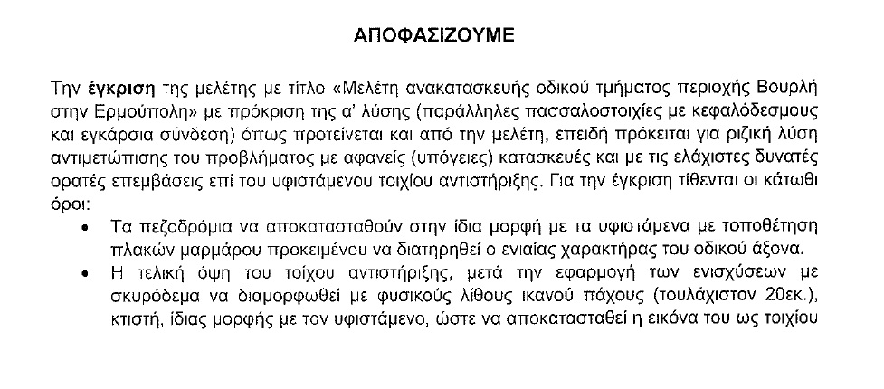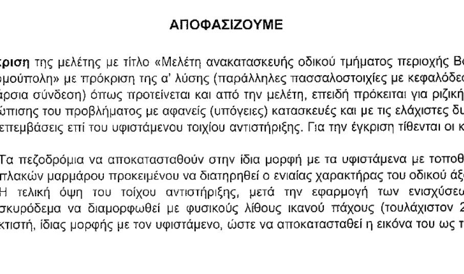 “Την προηγούμενη Πέμπτη, μετά από επίμονες επικοινωνίες και συνεχείς πιέσεις μας ήρθε η τροποποιητική απόφαση του τοπικού συμβουλίου Νεοτέρων Μνημείων, η οποία απαλείφει τον όρο που είχε βάλει να επενδυθεί ο τοίχος αντιστήριξης με πέτρα, γεγονός που σύμφωνα με τον μελετητή θα επιβάρυνε το συγκεκριμένο τοιχίο τουλάχιστον κατά 250 τόνους και υπήρχε ο φόβος της κατάρρευσης” γνωστοποίησε ο αρμόδιος Αντιδήμαρχος, φωτίζοντας μάλιστα και τον λόγο της καθυστέρησης έκδοσης της απάντησης του Υπ. Πολιτισμού ως και σήμερα.
