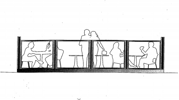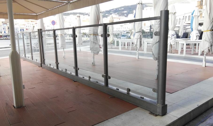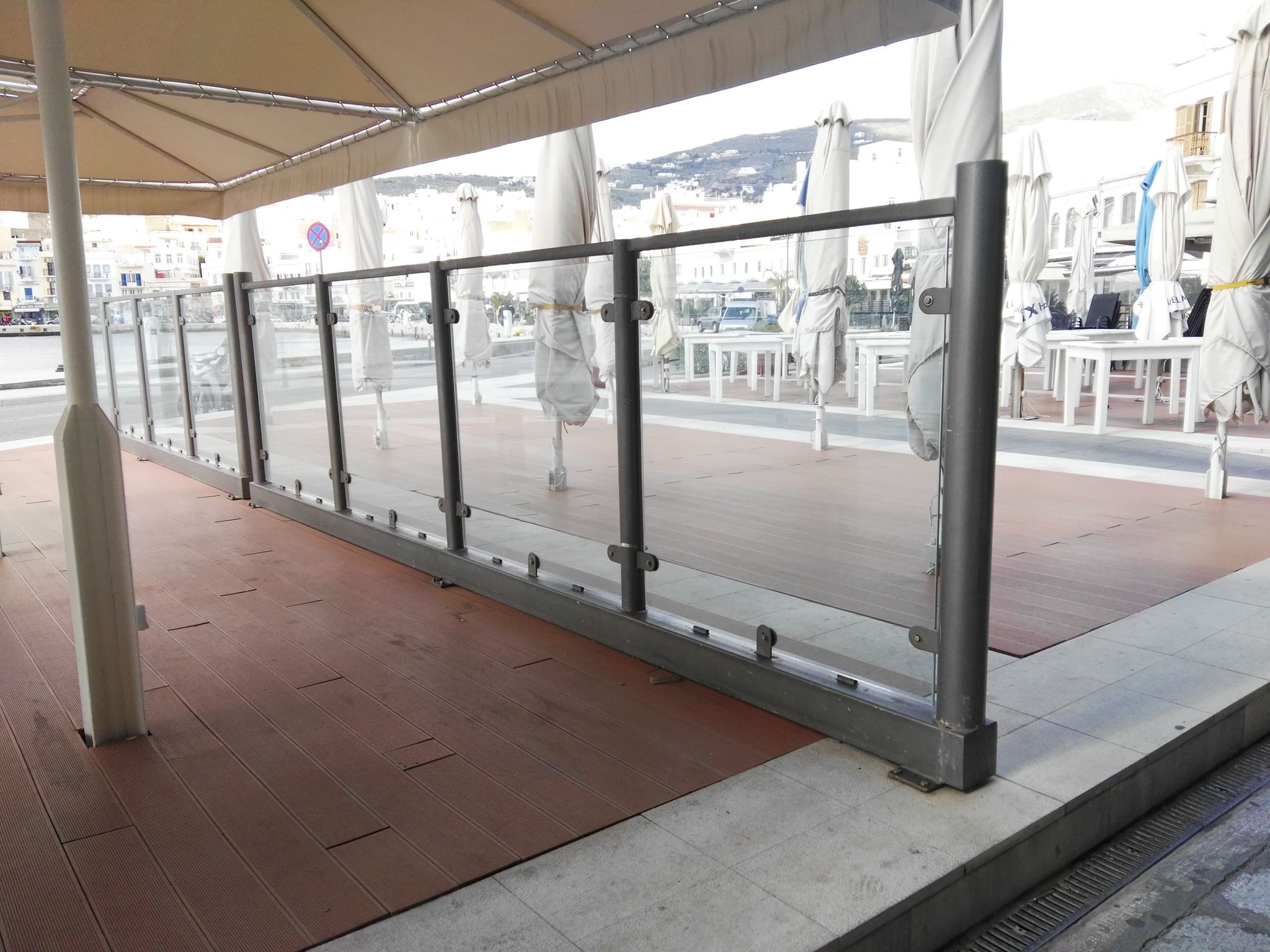 “Η μεταλλική κατασκευή θα στηρίζεται πάνω σε βάση ύψους 0,15m, τα πλαίσια θα έχουν διαστάσεις 1,15 m ύψος, και 1.35 m πλάτος. Στις άκρες θα υπάρχουν ορθοστάτες ύψους 1,40 m και διαμέτρου Φ140, ενώ ανάμεσα στα πλαίσια θα υπάρχουν ορθοστάτες ύψους 1,25 m και διαμέτρου Φ90 και υαλοπίνακες. Η στήριξή τους στα δάπεδα θα γίνει με ανοξείδωτα αγκύρια και παρεμβύσματα. Όλη η μεταλλική κατασκευή θα είναι σε απόχρωση επιλογής της υπηρεσίας.