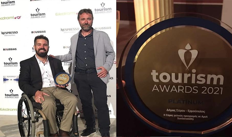 Η πρόοδος της Σύρου σε επίπεδο βελτίωσης και ανάπτυξης υποδομών για την εξυπηρέτηση και φιλοξενία των ΑΜΕΑ τιμήθηκε στη φετινή διοργάνωση των Tourism Awards 2021, με τον συμπολίτη μας, Νίκο Ρούσσο και τον Αντιδήμαρχο, Παναγιώτη Κουταβά να παραλαμβάνουν το platinum βραβείο για την πρωτεύουσα των Κυκλάδων, στην κατηγορία της προσβασιμότητας.