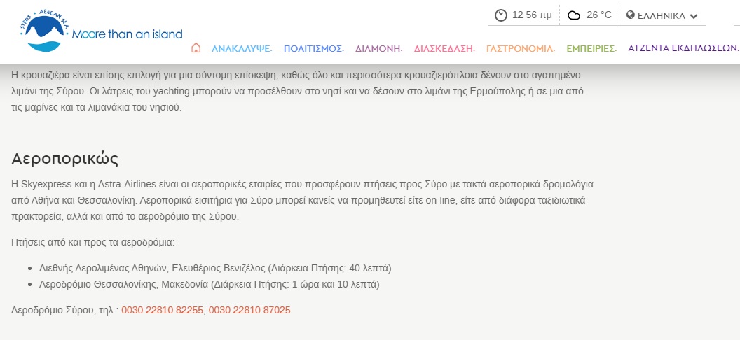 Δυστυχώς, τα τελευταία έξι χρόνια, το εν λόγω portal περιλαμβάνει ελλιπή στοιχεία για το νησί, καθώς επίσης λανθασμένες αναφορές, αλλά ακόμη και μη ορθές πληροφορίες για τη σύνδεση της Σύρου, με κραυγαλέο παράδειγμα τη σημείωση πως η Σύρος διαθέτει αεροπορική σύνδεση με Θεσσαλονίκη.