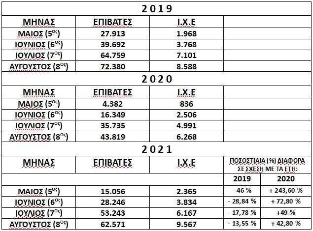 Ενδιαφέρον παρουσιάζουν και στοιχεία των αφίξεων σχετικά με τα οχήματα που μετακινήθηκαν στη Σύρο κατά τον μήνα Αύγουστο. Συγκεκριμένα, το 2019 είχαμε 8.588 Ι.Χ. και το 2021 ήρθαν 9.567 Ι.Χ..