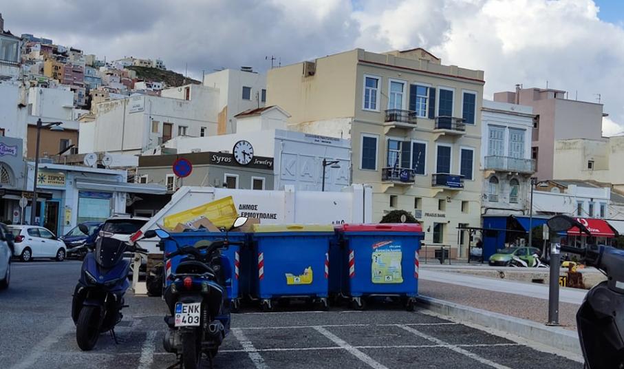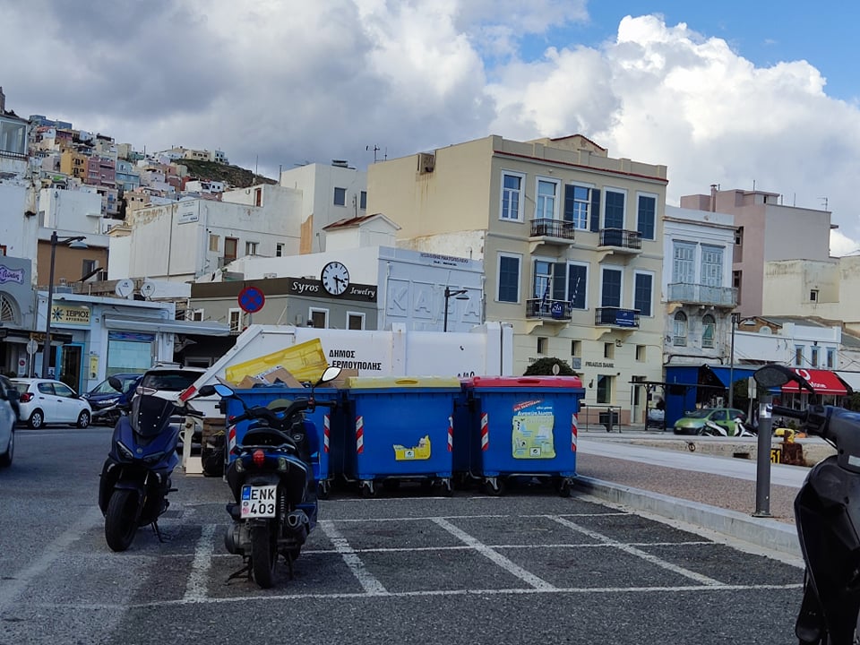 Ο αυξημένος όγκος των ανακυκλώσιμων υλικών στους δρόμους της Σύρου διαμόρφωνε συχνά “λοφίσκους” από χαρτοκιβώτια, κούτες, μπουκάλια και πλαστικά, με αποτέλεσμα η πρωτεύουσα των Κυκλάδων να παρουσιάσει μία εικόνα που δεν της αρμόζει.