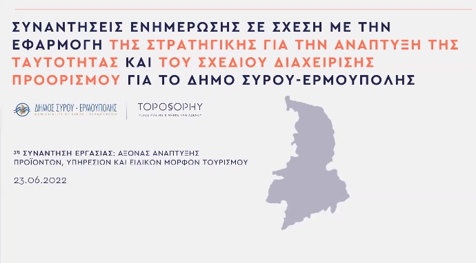 Οριστικοποιήθηκε το σχέδιο της τουριστικής ανάπτυξης της Σύρου και βασικά σημεία του παρουσιάστηκαν χθες, στο πλαίσιο ειδικής ενημερωτικής εκδήλωσης του Δήμου Σύρου – Ερμούπολης, με βασικούς ομιλητές τα στελέχη της Toposophy.