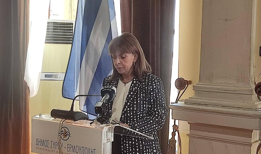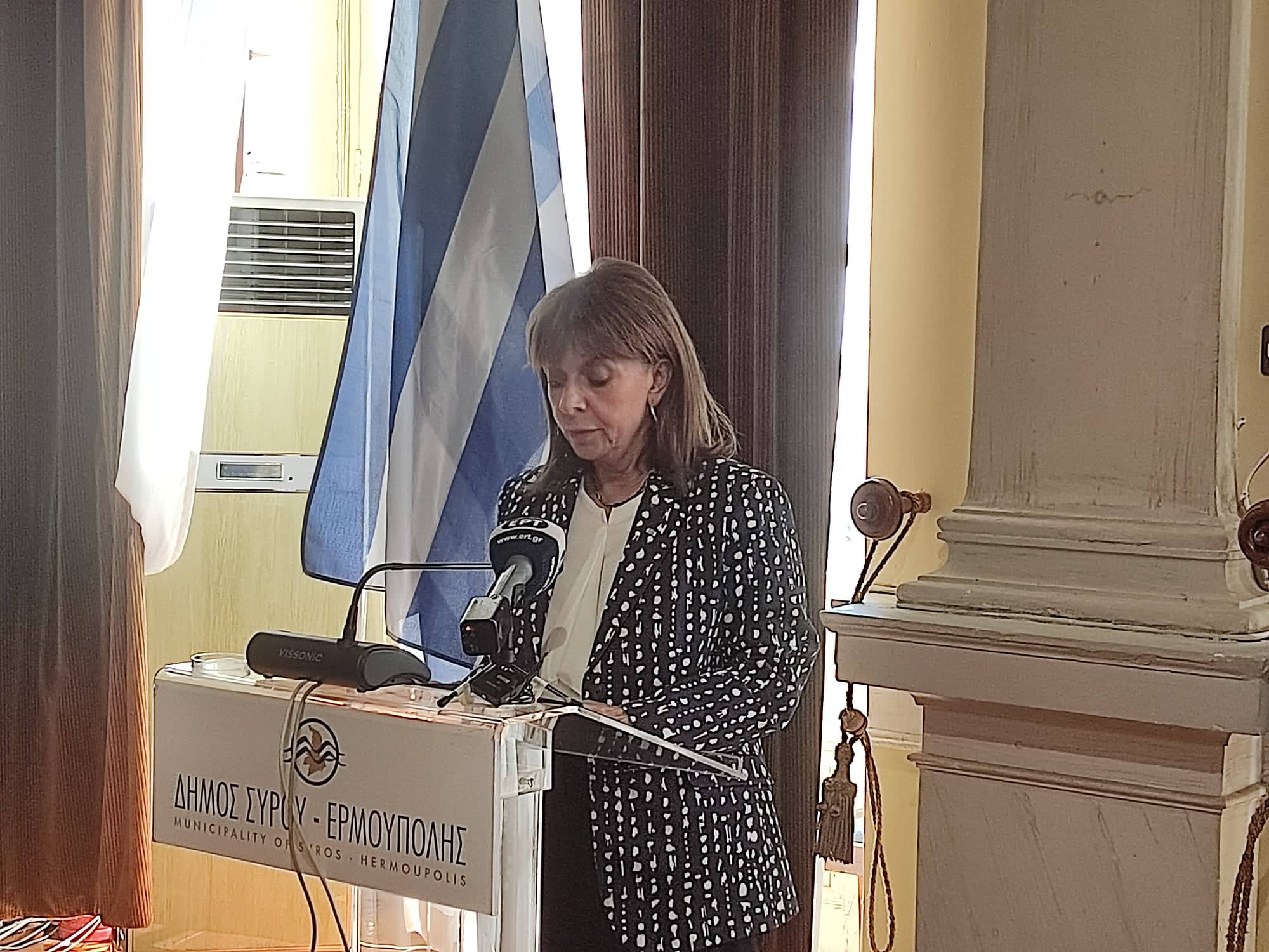 Ανακηρύχθηκε επίσημα επίτιμη δημότης Σύρου – Ερμούπολης, η Πρόεδρος της Δημοκρατίας, Κατερίνα Σακελλαροπούλου, σήμερα το μεσημέρι, στο πλαίσιο μίας λιτής τελετής στο Δημαρχιακό Μέγαρο της πρωτεύουσας των Κυκλάδων.