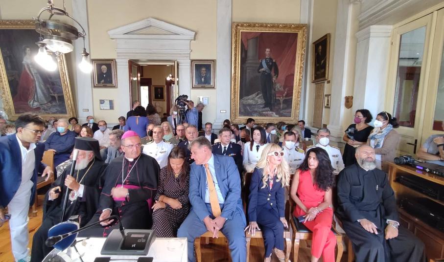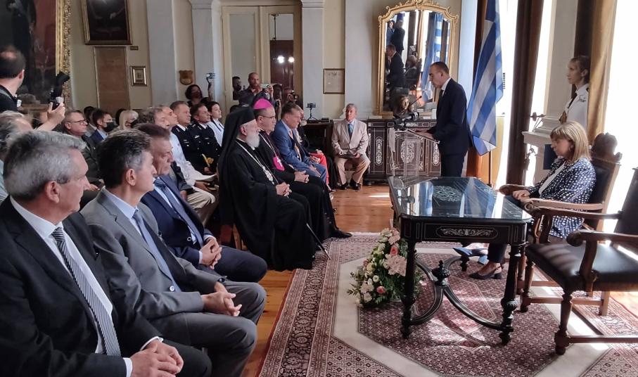 “Με ιδιαίτερη χαρά και ξεχωριστή τιμή υποδεχόμαστε σήμερα στο εμβληματικό Δημοτικό Μέγαρο του ιστορικού Δήμου Σύρου – Ερμούπολης την Αυτής Εξοχότητα Πρόεδρο της Δημοκρατίας, Κατερίνα Σακελλαροπούλου. Ειδικά τη φετινή χρονιά, κατά την οποία τιμούμε την επέτειο των 100 χρόνων από τη Μικρασιατική Καταστροφή, η παρουσία της Εξοχότατης Προέδρου λαμβάνει συμβολική σημασία δεδομένου ότι η Σύρος και η Ερμούπολη, η πόλη που γεννήθηκε από πρόσφυγες στις φλόγες της Επανάστασης του 1821 δέχθηκε το δεύτερο κύμα προσφύγων από τη Μικρά Ασία το 1922” ανέφερε προλογικά στην ομιλία του ο Δήμαρχος, Νίκος Λειβαδάρας, ευχαριστώντας την κα Σακελλαροπούλου για την αποδοχή της πρόσκλησης του Δήμου.