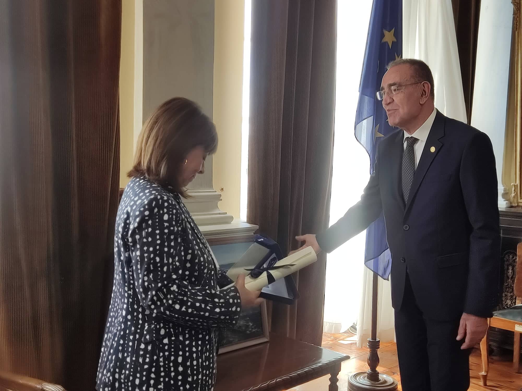 Συμπληρώνοντας μάλιστα πως η ίδια αποφοίτησε από το Αρσάκειο ενώ είναι πτυχιούχος της Νομικής Σχολής του Πανεπιστημίου Αθηνών, υπογράμμισε πως, “Ανήλθατε στα ανώτατα Δικαστικά αξιώματα με παράλληλη ακαδημαϊκή καριέρα και πλούσιο ακαδημαϊκό έργο με θέματα κυρίως περιβαλλοντικού και χωροταξικού δικαίου, ισότητας των φύλων, προστασίας των ατομικών δικαιωμάτων και κατοχύρωσης του κράτους δικαίου”. Αυτή η λαμπρή και δημιουργική πορεία της ίδιας, τόνισε ο Δήμαρχος προς εκείνη πως, “σας οδήγησε επάξια τον Ιανουάριο του 2020, στο υπέρτατο πολιτειακό αξίωμα της Προέδρου της Ελληνικής Δημοκρατίας και μάλιστα ως της πρώτης γυναίκας στην ιστορία της χώρας μας”.