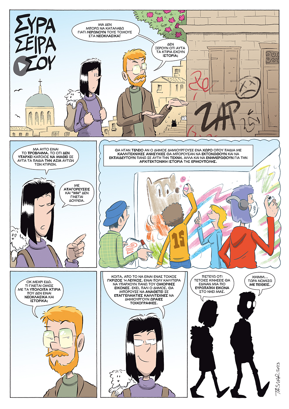 Με το σοβαρό πρόβλημα της αισθητικής υποβάθμισης του μοναδικού αρχιτεκτονικού χαρακτήρα της πόλης μας, που προκαλείται από τις ανεξέλεγκτες και καταστροφικές παρεμβάσεις σε εξωτερικούς τοίχους διατηρητέων κτιρίων, ασχολείται το νέο κόμικ τοίχου της ομάδας«ΣΥΡΑ, ΣΕΙΡΑ ΣΟΥ».