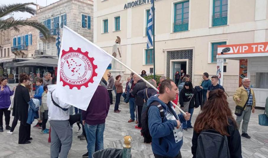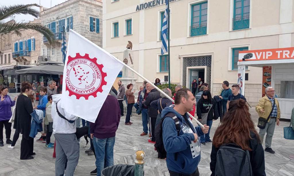 Η δεύτερη συγκέντρωση διαμαρτυρίας πραγματοποιήθηκε έξω από το κτήριο της Αποκεντρωμένης Διοίκησης Αιγαίου, όπου συμμετείχαν εργαζόμενοι στο δημόσιο τομέα, εκπρόσωποι του Σωματείου Ιδιωτικών Υπαλλήλων Κυκλάδων, καθώς και εκπαιδευτικοί.