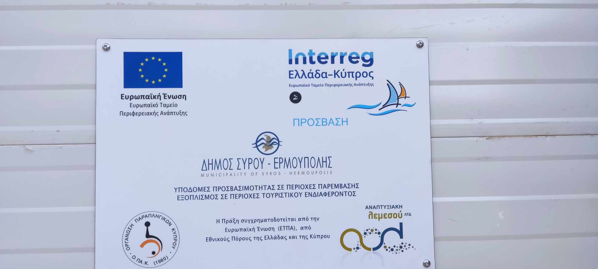 Σύμφωνα με όσα έχουν γίνει γνωστά, από το ανωτέρω έργο (250.000 ευρώ) για τον Δήμο Σύρου – Ερμούπολης έχουν αποκτηθεί τα εξής: 1. Λυόμενος ξύλινος αρθρωτός διάδρομος παραλίας για ΑΜΕΑ (100 μέτρα), 2. Υποδομή μηχανισμού αυτόνομης πρόσβασης στη θάλασσα (1 τεμάχιο), 3. Ξύλινο αποδυτήρια προδιαγραφών για ΑΜΕΑ, μη μόνιμο, λυόμενο (3 τεμάχια), 4. Προμήθεια και τοποθέτηση επιγραφής σήμανσης (πληροφοριακή πινακίδα) με στύλο στήριξης για την κατάδειξη των θέσεων βοηθητικών εγκαταστάσεων και εξοπλισμών εξυπηρέτησης ΑΜΕΑ (50 τεμάχια), 5. Προμήθεια και τοποθέτηση ξύλινης ομπρέλας με καλαμωτή για ΑΜΕΑ διαμέτρου 2,2 μέτρων (9 τεμάχια), 6. Σύστημα ανάβασης σκάλας αναπηρικού αμαξιδίου (2 τεμάχια), 7. Διάδρομος εύκαμπτος (120 μέτρα), 8. Ηλεκτρικό αναπηρικό scooter ενισχυμένο βαρέως τύπου (4 τεμάχια), 9. Ηλεκτρικό αναπηρικό scooter ελαφρού τύπου (4 τεμάχια), 10. Οικίσκος φόρτισης των scooters και μετεπιβίβασης ΑΜΕΑ (4 τεμάχια), 11. Σύστημα καθοδήγησης ατόμων με προβλήματα όρασης (2 τεμάχια).