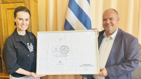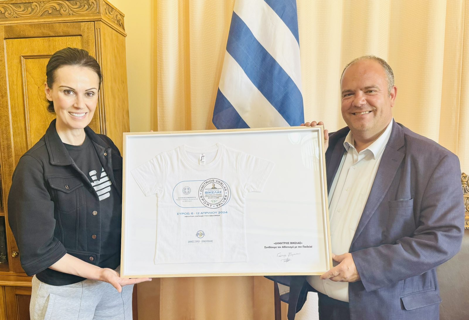 Η Εβδομάδα Αθλητικής, Ολυμπιακής, Παραολυμπιακής Παιδείας, Ιστορίας & Αξιών ΔΗΜΗΤΡΙΟΣ ΒΙΚΕΛΑΣ ολοκληρώθηκε με την απονομή προς τον Δήμαρχο Σύρου - Ερμούπολης κ. Αλέξη Αθανασίου ενός αναμνηστικού που περιλαμβάνει το μπλουζάκι της διοργάνωσης. Την απονομή πραγματοποίησε η επικεφαλής του ΥΠΕΘΑ Δρ. Ιλεάνα Κλοκώνη, η οποία και ευχαρίστησε θερμά τον Δήμαρχο για την άψογη συνδιοργάνωση στο πρόγραμμα ΔΗΜΗΤΡΙΟΣ ΒΙΚΕΛΑΣ.