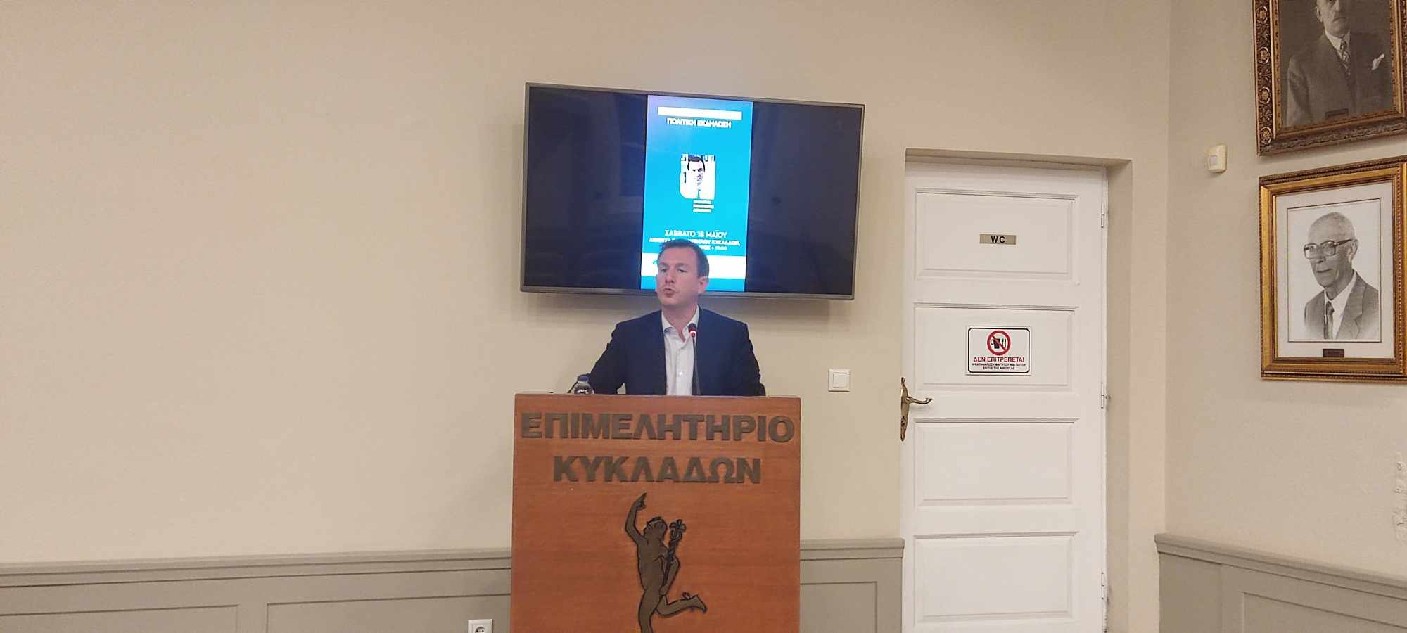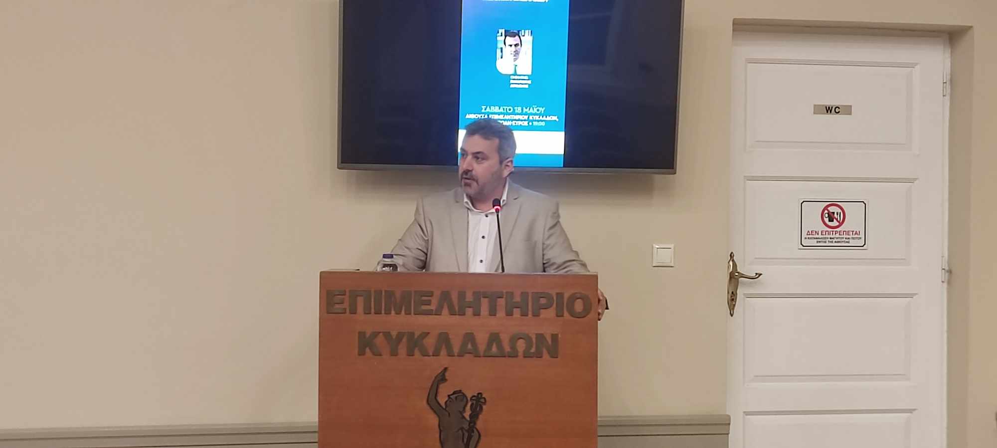 Εστιάζοντας στα θέματα των νησιών, επεσήμανε πως τα προβλήματα που βιώνουν οι κάτοικοι είναι μεγάλα. Χαρακτηριστικά μίλησε για την υποστελέχωση και την υποβάθμιση των δομών Υγείας, όπως δυστυχώς και του Νοσοκομείου Σύρου, για την πτητική βάση του ΕΚΑΒ στη Σύρο, που άλλοτε έχει ελικόπτερο και άλλοτε όχι, για τις ακτοπλοϊκές συνδέσεις των νησιών και ειδικότερα για την απαξίωση που έχει δεχθεί το Μεταφορικό Ισοδύναμο, καθώς και για τα παλιά πλοία με τα οποία μετακινούνται οι πολίτες από νησί σε νησί. Αναφέρθηκε ακόμη στην ακρίβεια των εισιτηρίων, στη γενικότερη ακρίβεια που χτυπά τα νησιά συγκριτικά με την υπόλοιπη Ελλάδα, καθώς και στα προβλήματα εύρεσης και παραμονής σπιτιών, με φόντο το υψηλό κόστος των ενοικίων για ιατρούς, εκπαιδευτικούς κ.α..