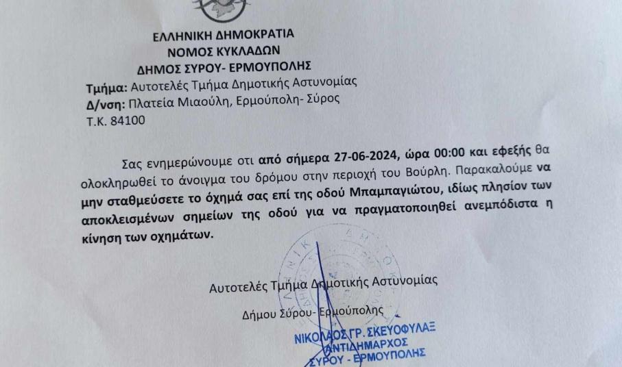 Πρόκειται για μία θετική εξέλιξη για την οποία ενημερώνει ο Δήμος με ανακοινώσεις του στα σταθμευμένα οχήματα της οδού Μπαμπαγιώτου, τα οποία και θα πρέπει να απομακρυνθούν.