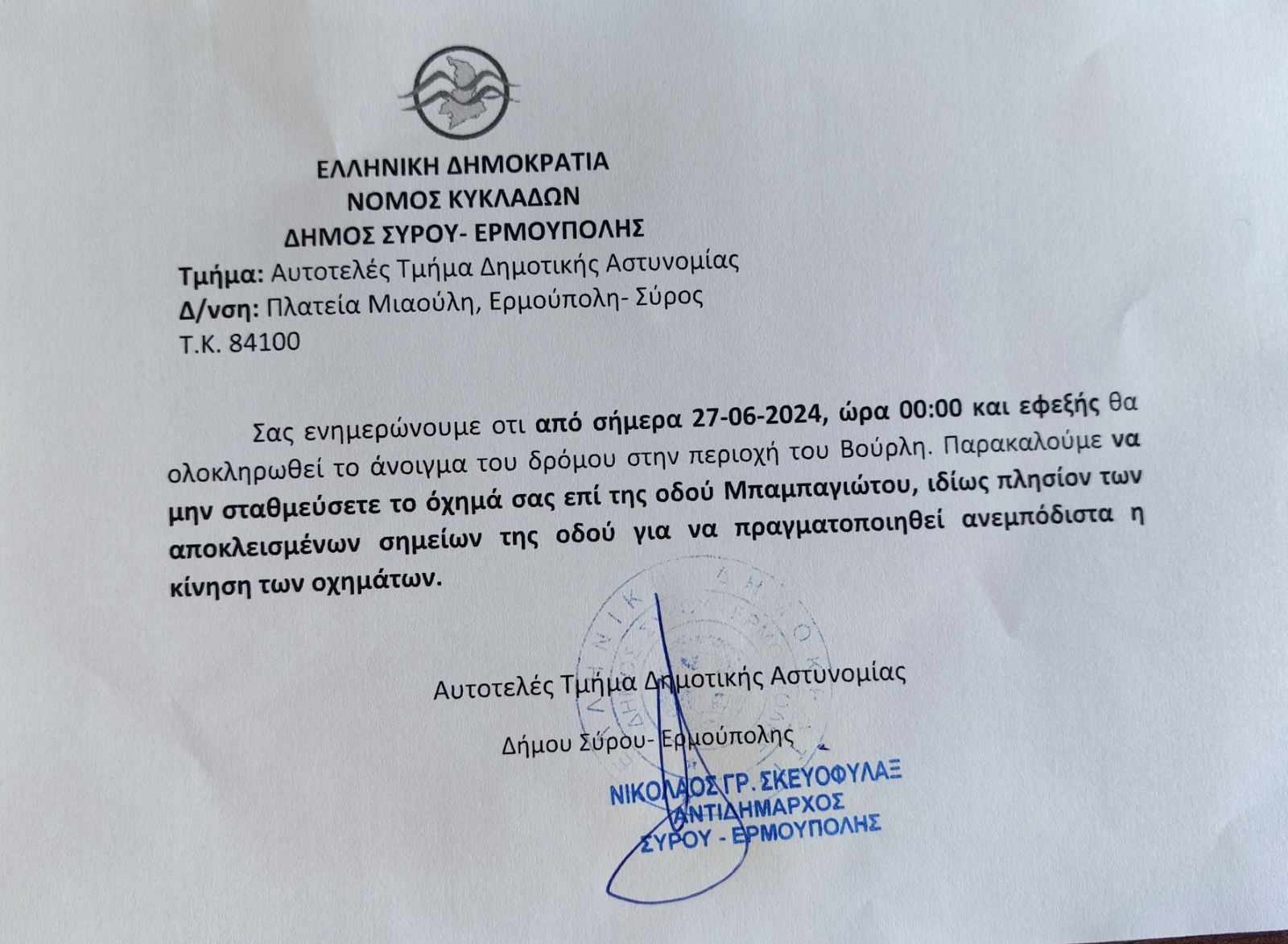 Δεδομένης της προσωρινής απουσίας του δημοτικού αστυνόμου, ο αντιδήμαρχος Διοικητικών Υπηρεσιών, Νίκος Σκευοαφύλακας μοίρασε τις ανακοινώσεις.