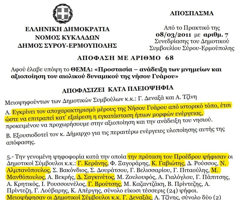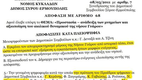 Με αυτή την στρατηγικής σημασίας για την «επιχειρηματική αξιοποίηση» του νησιού απόφαση, δημοτικών συμβούλων που σήμερα είναι μοιρασμένοι σε όλες τις υπόλοιπες παρατάξεις του ΔΣ, κατατέθηκε το αίτημα στο Υπουργείο Πολιτισμού και αποχαρακτηρίστηκε το σύνολο της Γυάρου ως ιστορικού τόπου (από 23.000στρ έμειναν μόνο τα 2.500στρ - ΦΕΚ 182/21-7-2011) και παράλληλα έδωσαν το πράσινο φως στο «ΕΝΕΡΓΕΙΑΚΟ ΚΕΝΤΡΟ ΑΝΑΝΕΩΣΙΜΩΝ ΠΗΓΩΝ ΕΝΕΡΓΕΙΑΣ ΚΥΚΛΑΔΩΝ» (κοινοπραξία J&P ΑΒΑΞ, ΓΕΚ- ΤΕΡΝΑ και ΙΤΑ) και στην ΑΙΟΛΙΚΗ ΟΛΥΜΠΟΥ ΕΥΒΟΙΑΣ θυγατρική της ΕΛΛΑΚΤΩΡ, να γαζώσουν τις βουνοκορφές του νησιού με ανεμογεννήτριες.