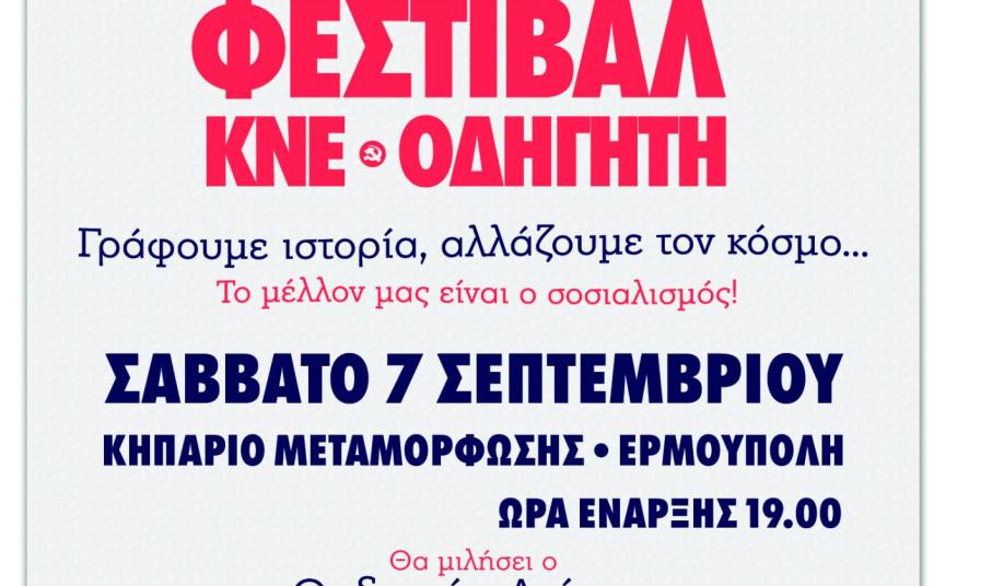 Στη Σύρο και συγκεκριμένα στο κηπάριο της Μεταμόρφωσης, θα πραγματοποιηθεί το Σάββατο 7 Σεπτέμβρη στις 7 το απόγευμα, το 50ο Φεστιβάλ ΚΝΕ – «Οδηγητή», με σύνθημα "Γράφουμε Ιστορία, αλλάζουμε τον κόσμο - Το μέλλον μας είναι ο σοσιαλισμός!".