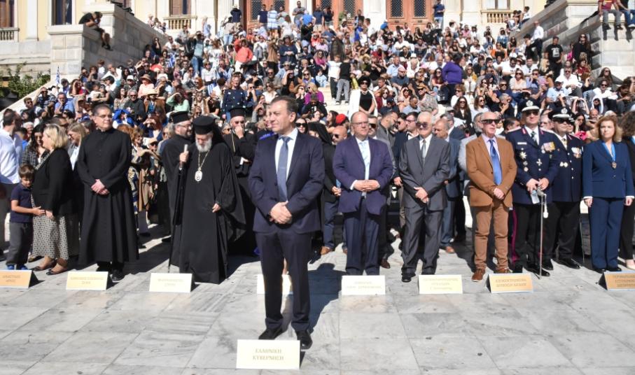 Η παρέλαση στην πλατεία Μιαούλη αποτέλεσε την κορύφωση των επετειακών εκδηλώσεων για την 28η Οκτωβρίου, της οποίας προηγήθηκε η δοξολογία στον Ι.Ν. του Αγίου Νικολάου Ερμούπολης, με τη συμμετοχή πολλών εκπροσώπων της Αυτοδιοίκησης του Α΄ και του Β΄ βαθμού, εκπροσώπων φορέων και κομματικών οργανώσεων, βουλευτών του νομού και εκπροσώπων των Σωμάτων Ασφαλείας.