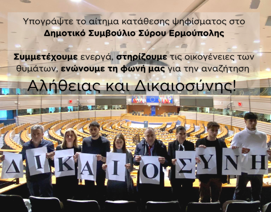 Ανακοίνωση για τα Τέμπη και τη συλλογή υπογραφών εξέδωσε η δημοτική παράταξη "Σύρος Εξ Αρχής". Αναλυτικά αναφέρει: "Η Δημοτική Παράταξη «Σύρος Εξ Αρχής» καλεί όλους τους πολίτες της Σύρου να συνυπογράψουν το αίτημα που θα κατατεθεί στο Δημοτικό Συμβούλιο Σύρου - Ερμούπολης, με σκοπό την έκδοση ψηφίσματος συμπαράστασης στους συγγενείς των θυμάτων του τραγικού δυστυχήματος στον Ευαγγελισμό Τεμπών στις 28 Φεβρουαρίου 2023 και την υποστήριξη των δίκαιων αιτημάτων του «Συλλόγου Πληγέντων Δυστυχήματος Τεμπών 28/2/2023». Το ψήφισμα αυτό ακολουθεί το παράδειγμα του Δημοτικού Συμβουλίου Τήνου, το οποίο το έχει ήδη ομόφωνα υιοθετήσει. Συλλογή Υπογραφών: https://forms.gle/w4BDQCXXbC1dyBdw7 Συμμετέχουμε ενεργά, στηρίζουμε τις οικογένειες των θυμάτων και ενώνουμε τη φωνή μας για την αναζήτηση αλήθειας και δικαιοσύνης".