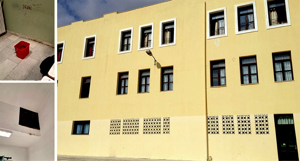 Σε απόσταση αναπνοής από τα θρανία των μαθητών στο 1ο Γυμνάσιο Σύρου βρίσκονται κουβάδες για τη συλλογή του νερού που “τρυπώνει” από την οροφή, σε ημέρες με έντονη βροχόπτωση, καθώς ως φαίνεται, υπάρχουν άλυτα προβλήματα στη μόνωση.