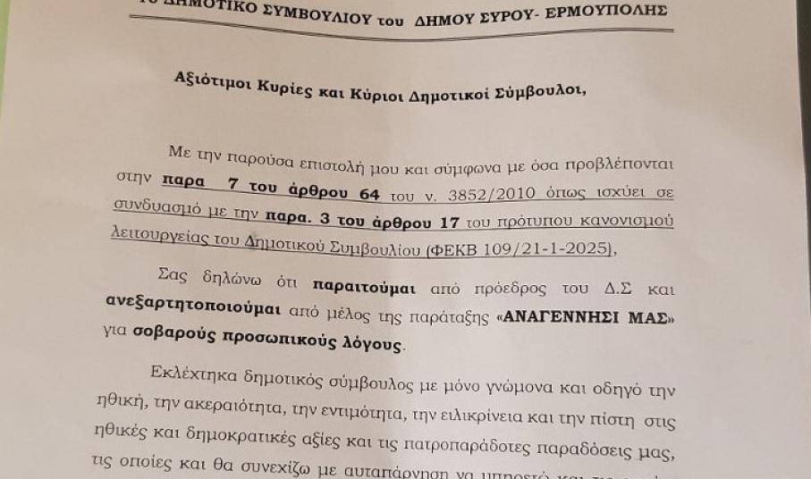Σύμφωνα με το έγγραφο που απέστειλε προς τη δημοτική αρχή η παραίτησή του γίνεται για καθαρά προσωπικού λόγους. Μάλιστα, στο έγγραφο αφήνει σαφές αιχμές για τον τρόπο λειτουργίας του οργάνου και της δημοτικής αρχής.