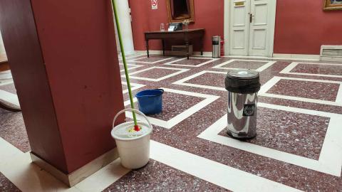 Με “δράμα” που επαναλαμβάνεται κάθε χειμώνα μοιάζει τα τελευταία χρόνια η κατάσταση που επικρατεί στο πολύπαθο Πνευματικό Κέντρο Ερμούπολης, τις βροχερές ημέρες, καθώς το νερό εισρέει στο εσωτερικό του, με ό,τι αυτό συνεπάγεται για την περαιτέρω υποβάθμιση και φθορά του ιστορικού κτηρίου.