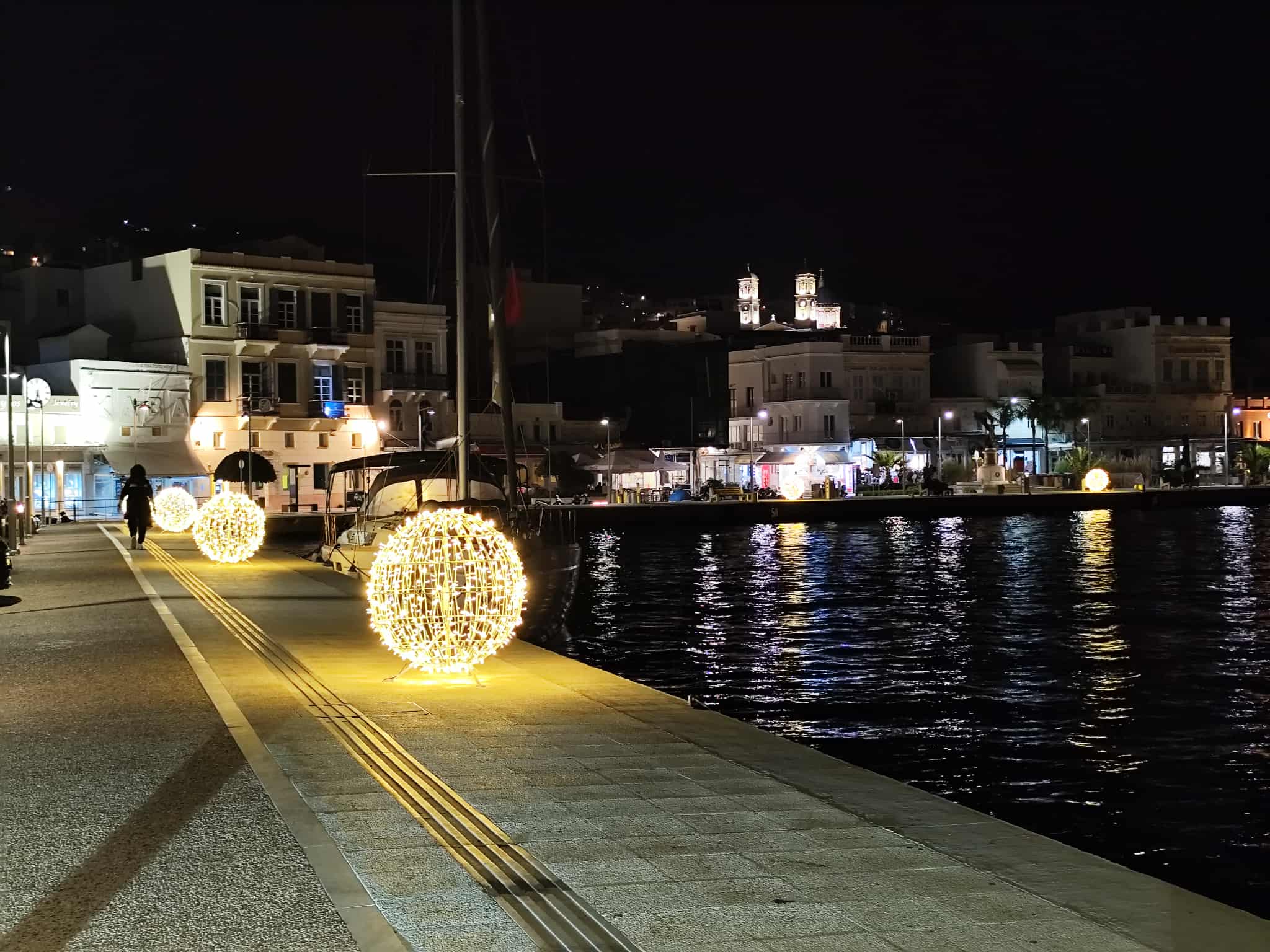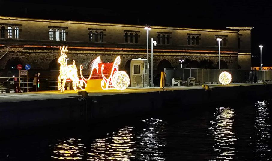 Φωτίστηκε στον… ρυθμό των Χριστουγέννων το παραλιακό μέτωπο της Ερμούπολης σήμερα το απόγευμα, μετά από φροντίδα και ενέργειες του Λιμενικού Ταμείου Σύρου, ενόψει των γιορτών.