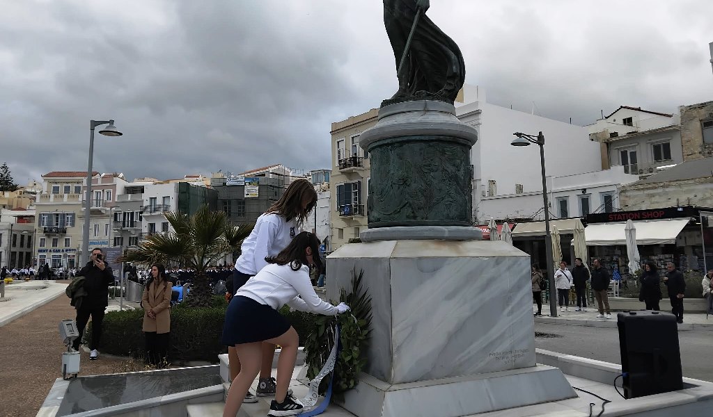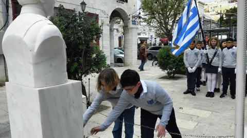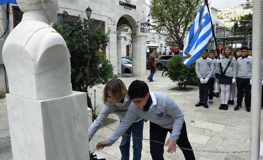 Συγκεκριμένα, σήμερα λίγο μετά τις 4 το απόγευμα, νέοι και νέες παρουσία, μεταξύ άλλων, του αντιπεριφερειάρχη Κυκλάδων, Γιώργου Λεονταρίτη, του δημάρχου Σύρου-Ερμούπολης, Αλέξη Αθανασίου, του εντεταλμένου δημοτικού συμβούλου του γραφείου Παιδείας, Ιωσήφ Ρούσσου, κατέθεσαν στεφάνια στα μνημεία της Ερμούπολης, αποδίδοντας τιμή στον αγώνα των προγόνων μας.