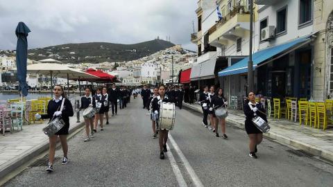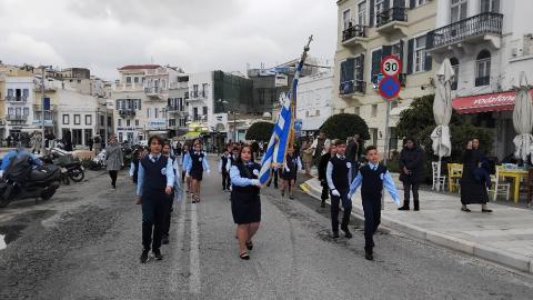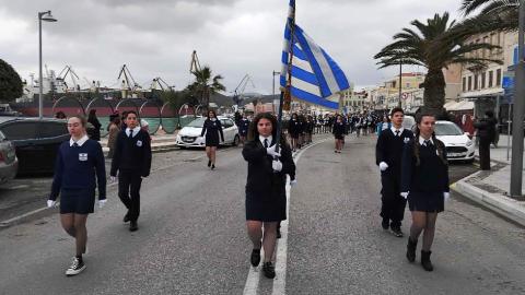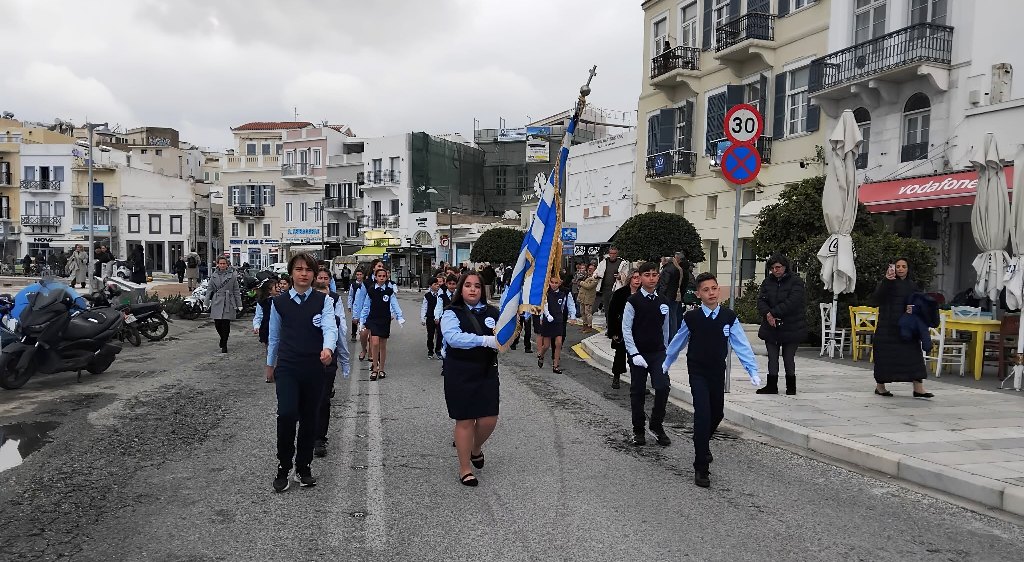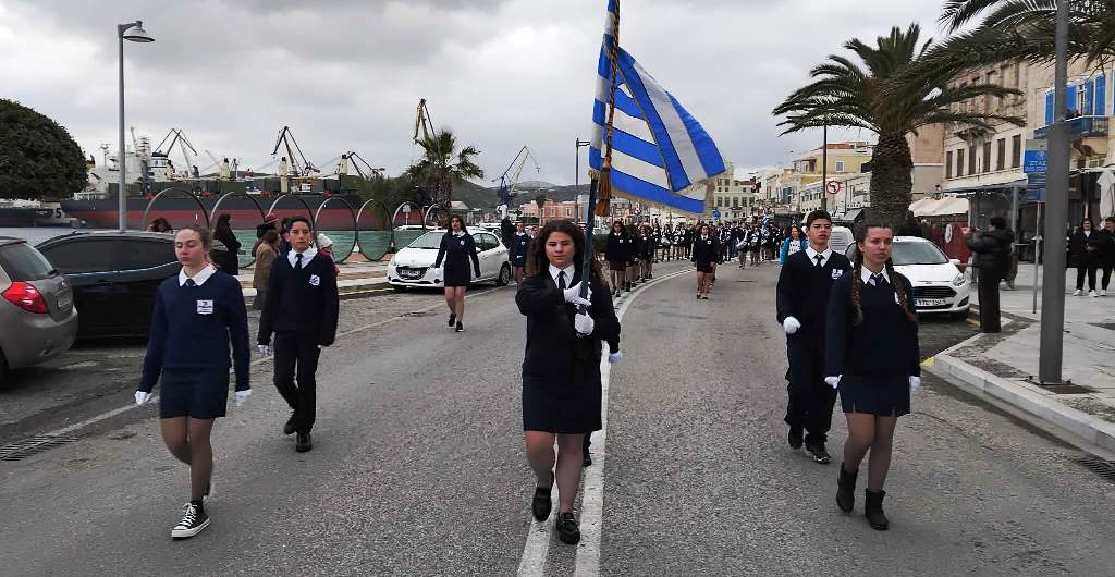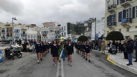 Η πομπή των μαθητών, των σπουδαστών και των προσκόπων, μέσω των κύριων οδών της πόλης κατευθύνθηκε στο Ηρώο των Πεσόντων στην πλατεία Ηρώων, όπου έγινε κατάθεση στεφάνων από τον χωρικό αντιπεριφερειάρχη Κυκλάδων, τους μαθητές του 4ου Πειραματικού Δημοτικού Σχολείου Ερμούπολης και του 5ου Δημοτικού Σχολείου Ερμούπολης, του Βαμβακάρειου Λυκείου των Εκπαιδευτηρίων "ΔΕΛΑΣΑΛ" Σύρου, του Πρότυπου ΕΠΑΛ Σύρου, του Εσπερινού ΕΠΑΛ Σύρου, του Ενιαίου Ειδικού Επαγγελματικού Γυμνασίου – Λυκείου Σύρου και τους σπουδαστές και τις σπουδάστριες της Σχολής Ανώτερης Επαγγελματικής Κατάρτισης του Γενικού Νοσοκομείου Σύρου.