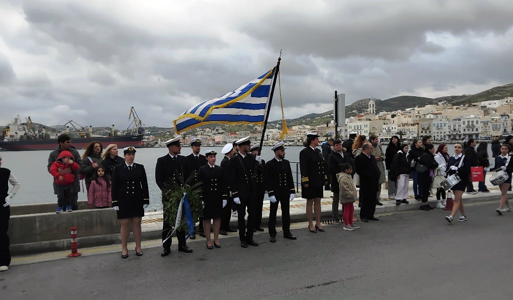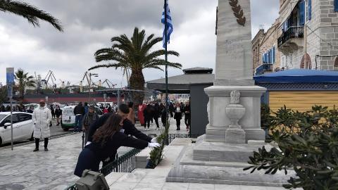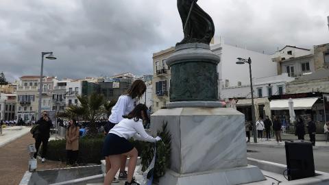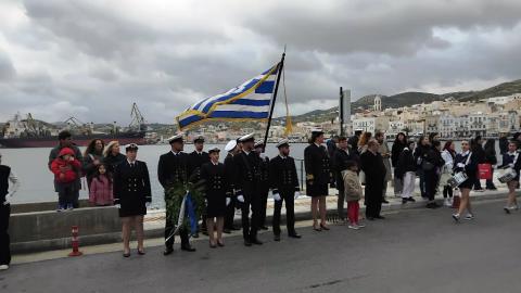 Ακολούθησε η κατάθεση στεφάνων στο Μνημείο Πεσόντων Ιερολοχιτών από μαθητές του 2ου Δημοτικού Σχολείου Ερμούπολης και του 1ου Πειραματικού Γυμνασίου Σύρου, στο Μνημείο Εθνικής Αντίστασης από μαθητές του 3ου Δημοτικού Σχολείου Ερμούπολης, του Βαμβακάρειου Γυμνασίου των Εκπαιδευτηρίων "ΔΕΛΑΣΑΛ" Σύρου και του 3ου Γυμνασίου Σύρου, στην προτομή του πυρπολητή Κανάρη από μαθητές του 2ου Γυμνασίου Σύρου, σπουδαστές της Ακαδημίας Εμπορικού Ναυτικού Σύρου και από τον Ναυτικό Όμιλο Σύρου. Τέλος, στον ανδριάντα του ναυάρχου Μιαούλη από μαθητές του Γενικού Λυκείου Σύρου και από το Σώμα Ελλήνων Προσκόπων.
