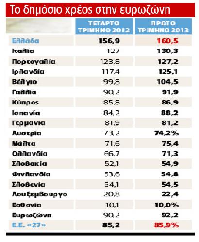 Μεταξύ των χωρών που ανήκουν στη ζώνη του ευρώ, η Ελλάδα έχει, το πρώτο τρίμηνο του τρέχοντος έτους, δημόσιο χρέος σε ποσοστό 160,5% του ΑΕΠ, που ισοδυναμεί με 305,2 δισ. ευρώ, έναντι 156,9% ή 303,9 δισ. ευρώ του τελευταίου τριμήνου του 2012.