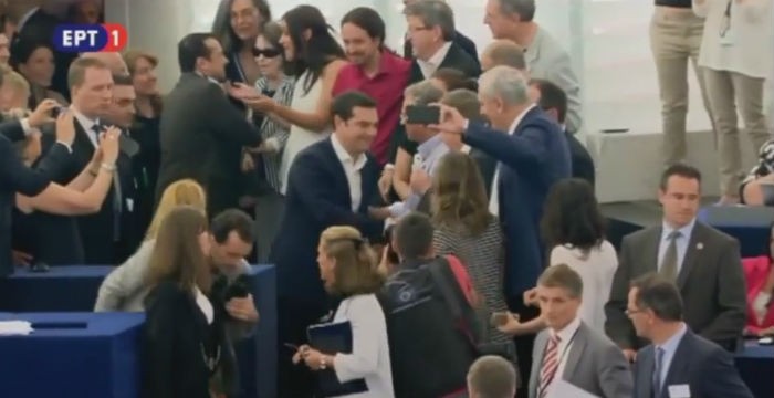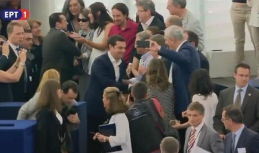 Με παρατεταμένα χειροκροτήματα και εκδηλώσεις συμπάθειας προς το πρόσωπο του υποδέχθηκαν στο Στρασβούργο οι ευρωπαίοι βουλευτές της Ολομέλειας του Ευρωπαϊκού Κοινοβουλίου, τον Έλληνα πρωθυπουργό τον οποίο υποδέχτηκε, φανερά εκνευρισμένος, ο πρόεδρος του Μάρτιν Σουλτς.