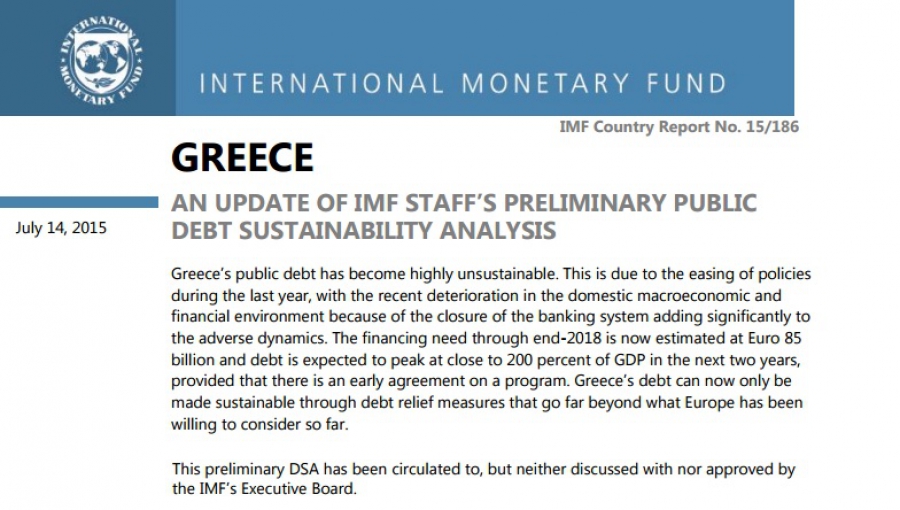Στην έκθεση του ΔΝΤ αναφέρεται συγκεκριμένα πως «Το ελληνικό δημόσιο χρέος έχει γίνει εξαιρετικά μη βιώσιμο. Αυτό οφείλεται στην χαλάρωση πολιτικών κατά τη διάρκεια του περασμένου έτους, με την πρόσφατη επιδείνωση στο εγχώριο μακροοικονομικό και χρηματοοικονομικό περιβάλλον λόγω του κλεισίματος του τραπεζικού συστήματος να επιβαρύνει σημαντικά την δυσμενή δυναμική».