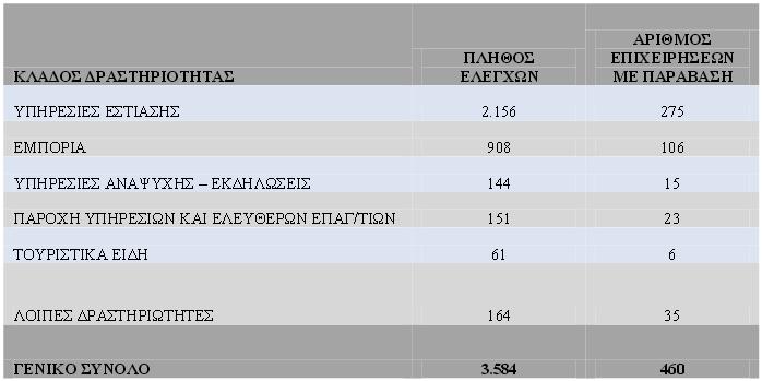 Οι έλεγχοι επικεντρώθηκαν σε μεγάλο βαθμό στους κλάδους εστίασης, διασκέδασης και τουρισμού, καθώς και εμπορίας.