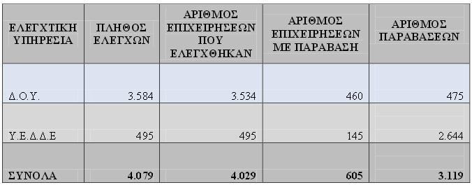 Από τις Δ.Ο.Υ της χώρας πραγματοποιήθηκαν 3.584 μερικοί επιτόπιοι έλεγχοι σε 3.534 επιχειρήσεις, στους οποίους συμμετείχαν 924 υπάλληλοι. Από τους ελέγχους αυτούς σε 460 επιχειρήσεις διαπιστώθηκαν συνολικά 475 παραβάσεις.