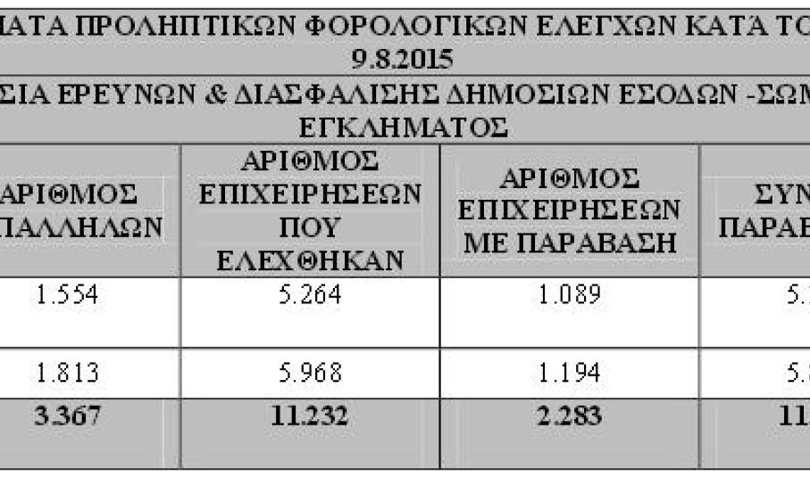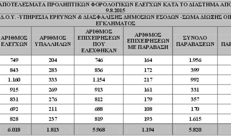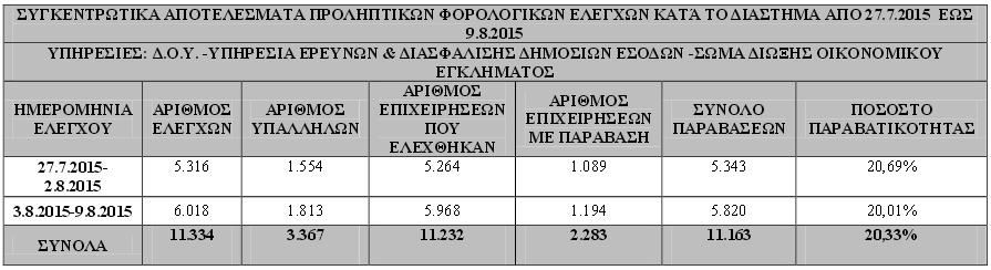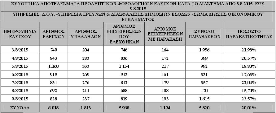 Η Γενική Γραμματεία Δημοσίων Εσόδων εφαρμόζοντας το επιχειρησιακό της σχέδιο για ενίσχυση και εντατικοποίηση των επιτόπιων ελέγχων, ιδίως στις τουριστικές περιοχές λόγω θερινής περιόδου, με στόχο την αντιμετώπιση της φοροδιαφυγής, ανακοινώνει τα συνοπτικά αποτελέσματα των μερικών επιτόπιων ελέγχων που πραγματοποιήθηκαν από τις Υπηρεσίες της (Δ.Ο.Υ. και Υ.Ε.Δ.Δ.Ε.) την εβδομάδα από 03.08.2015 έως 09.08.2015.