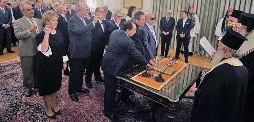 Τα μέλη της νέας κυβέρνησης ορκίστηκαν στο προεδρικό Μέγαρο, παρουσία του Προέδρου της Δημοκρατίας, Προκόπη Παυλόπουλου, από τον επίσκοπο Μεθώνης κ. Κλήμη.