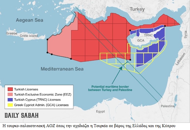 Στα σχετικά δημοσιευμένα επιχειρήματα αναφέρεται ότι μια τουρκο /παλαιστινιακή Συμφωνία για την ΑΟΖ «δεν παρενοχλεί την Αίγυπτο», (σ.σ. με την οποία η Άγκυρα θέλει διακαώς να καταλήξει σε συμφωνία ΑΟΖ), «αλλά καταστρέφει τα σχέδια της Ελλάδας και της Ε/Κ πλευράς στην περιοχή, αν επεκταθεί η τουρκική δικαιοδοσία στη Μεσόγειο». Στον σχετικό μάλιστα τουρκικό χάρτη έχει εξαφανιστεί το Καστελόριζο και η ΑΟΖ του, ενώ η περιοχή ανατολικά της Ρόδου θεωρείται «καθαρή» τουρκική ΑΟΖ, ενώ κατακερματίζεται η ΑΟΖ της Κυπριακής Δημοκρατίας,