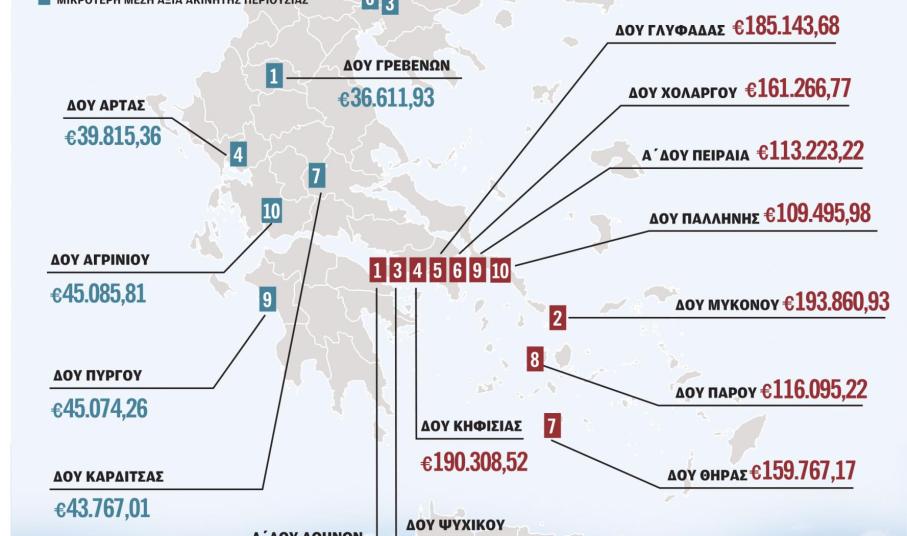 Στο κέντρο της Αθήνας, στο Ψυχικό, στην Κηφισιά, στη Γλυφάδα, στον Χολαργό αλλά και στη Μύκονο και τη Σαντορίνη εντοπίζονται οι μεγαλύτερες περιουσίες των ιδιοκτητών. Από την επεξεργασία των στοιχείων της Ανεξάρτητης Αρχής Δημοσίων Εσόδων, μετά την αναπροσαρμογή των αντικειμενικών αξιών, οι 37.687 ιδιοκτήτες των ακριβών περιοχών του κέντρου της Αθήνας (υπάγονται στη Δ΄ Αθηνών) διαθέτουν μέση περιουσία ύψους 241.140 ευρώ. Προφανώς, οι εν λόγω φορολογούμενοι μπορεί να διαθέτουν και σε άλλες περιοχές ακίνητα, αλλά σε κάθε περίπτωση η μέση περιουσία διαμορφώνεται κατά κύριο λόγο από τα ακίνητα που διαθέτουν στο κέντρο της Αθήνας, όπου οι τιμές ζώνης είναι ιδιαίτερα υψηλές.