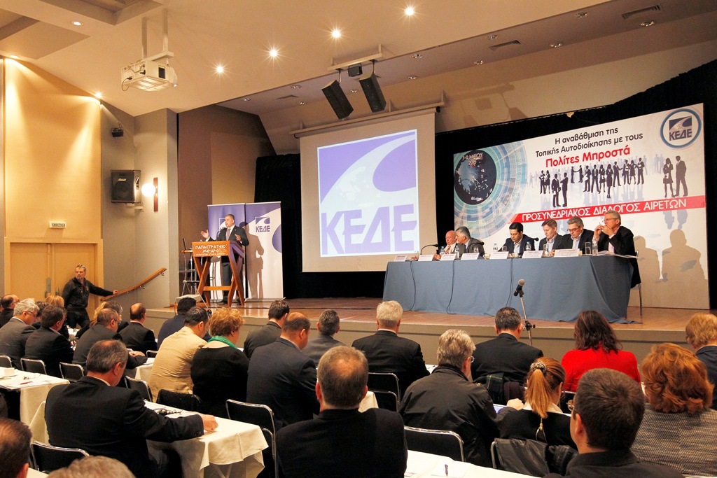 Αναφερόμενος ο πρόεδρος της ΚΕΔΕ στο περιβάλλον που λειτουργεί η Τοπική Αυτοδιοίκησησημείωσε πως τα τελευταία χρόνια υπέστη τις σημαντικότερες περικοπές, χρησιμοποιήθηκε ως πειραματόζωο και κλήθηκε να σηκώσει το βάρος της προσαρμογής της σε ένα νέο μοντέλο διοικητικής οργάνωσης της χώρας, τον Καλλικράτη, ο οποίος σχεδιάστηκε πρόχειρα, εφαρμόστηκε βιαστικά και το κυριότερο, δεν υποστηρίχθηκε επαρκώς οικονομικά από την Πολιτεία. Παράλληλα η Αυτοδιοίκηση, στην καρδιά της κρίσης, σήκωσε εξαιτίας της απουσίας του Κράτους, το κύριο βάρος για τη στήριξη εκατοντάδων χιλιάδων συμπολιτών μας