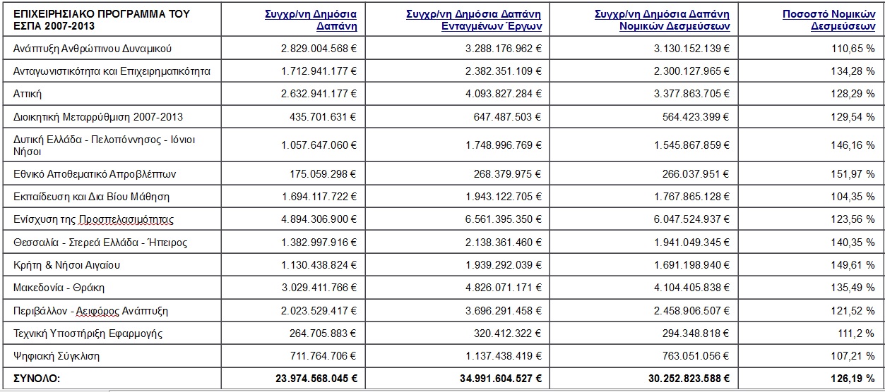 3. Για το ΕΣΠΑ 2007-2013 ο βαθμός απορρόφησης ανέρχεται στο 87,02%. Στον επόμενο πίνακα παρουσιάζονται αναλυτικά στοιχεία υλοποίησης.