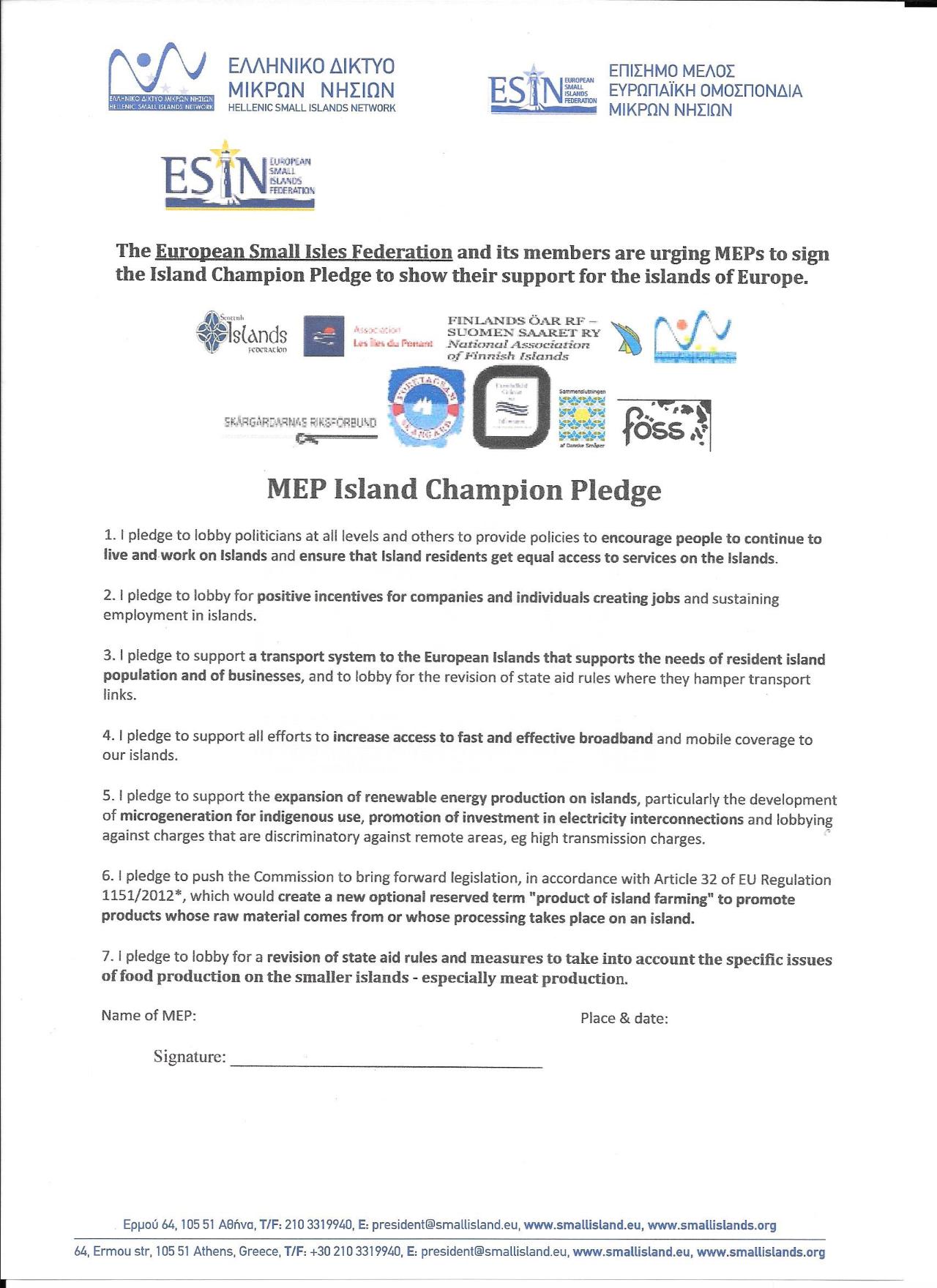 Τέλος δεσμεύονται, όλοι οι ευρωβουλευτές πού θα υπογράψουν, να πράξουν ότι είναι δυνατόν, ώστε να δημιουργηθούν οι προϋποθέσεις στα μικρά νησιά ανάπτυξης του πρωτογενούς τομέα και η καθιέρωση τίτλου προϊόντων μικρών νησιών, σύμφωνα με τις ευρωπαϊκές κοινοτικές οδηγίες.
