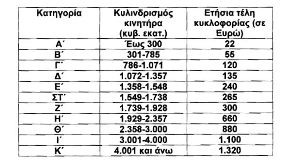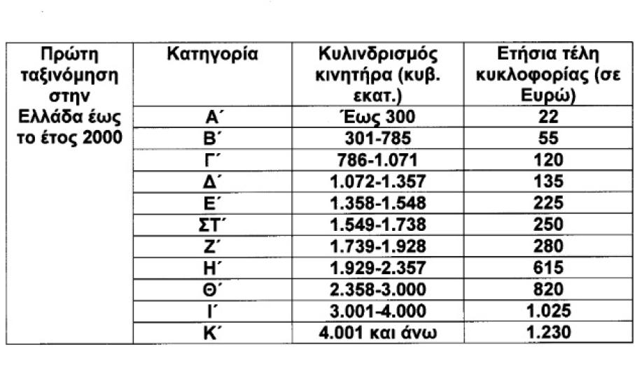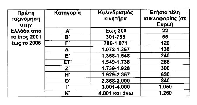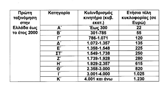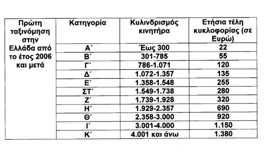 Πιο συγκεκριμένα, με την τροποποίηση του νόμου για τα τέλη κυκλοφορίας, στα επιβατικά αυτοκίνητα και τις δίκυκλες και τρίκυκλες μοτοσυκλέτες που έχουν ταξινομηθεί για πρώτη φορά στην Ελλάδα έως την 31-10-2010, θεσπίζονται τρεις κατηγορίες, για τις αντίστοιχες χρονικές περιόδους πρώτες ταξινόμησής τους, με βάση τον κυλινδριδμό του κινητήρα αυτών ως εξής: