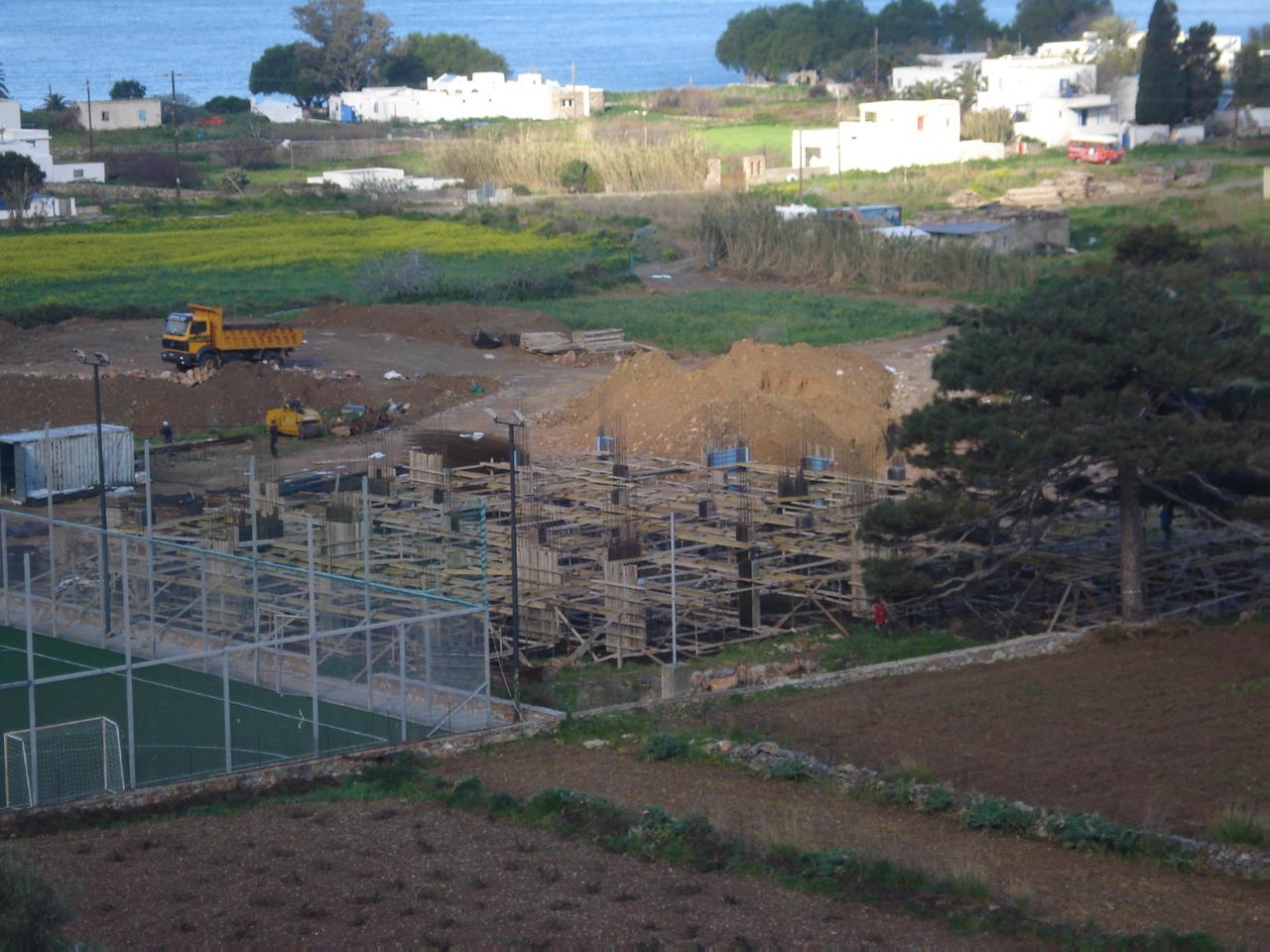 Σημειώνεται ότι η ανέγερση του κτιριακού συγκροτήματος Δημοτικού Σχολείου και Νηπιαγωγείου γίνεται σε εκτός σχεδίου πόλεως οικόπεδο επιφανείας Ε=10,687.00 m2, το οποίο παραχωρήθηκε στο δήμο από την Ιερά Μητρόπολη Θήρας, Αμοργού και Νήσων και συγκεκριμένα την Ιερά Μονή της Παναγίας Χοζοβιώτισσας Αμοργού.