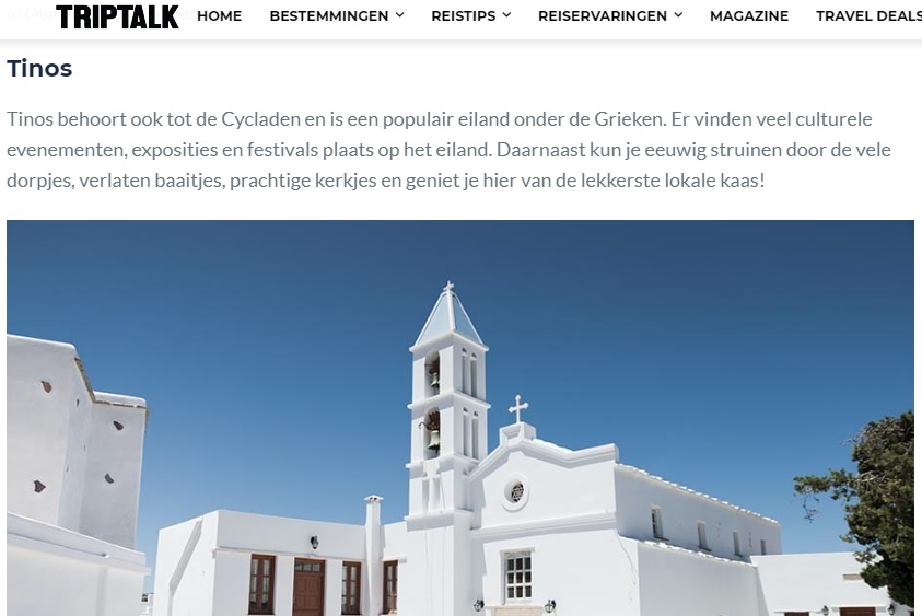 Eνθαρρυντικά μηνύματα για την εξέλιξη της νέας τουριστικής χρονιάς στην Τήνο εκπέμπουν δύο σημαντικά δημοσιεύματα από το Βέλγιο και την Ολλανδία. Το πρώτο προέρχεται από βελγικό περιοδικό που ειδικεύεται στους νέους (www.campus.be)και το δεύτερο από δημοφιλή ολλανδική ταξιδιωτική πλατφόρμα (www.triptalk.nl).