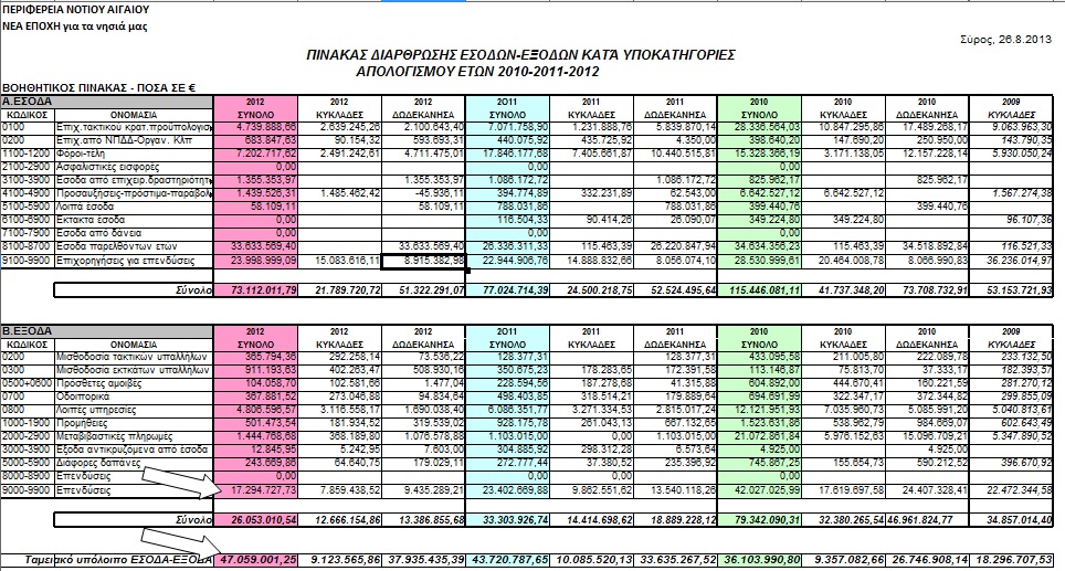 Για το νομό Κυκλάδων τα στοιχεία των εξόδων έχουν ως εξής: 2009 34.857.014,40 ευρώ, το 2010 32.380.265,654, το 2011 14.414.698,62 ευρώ και το 2012 12.666.154,86 ευρώ.