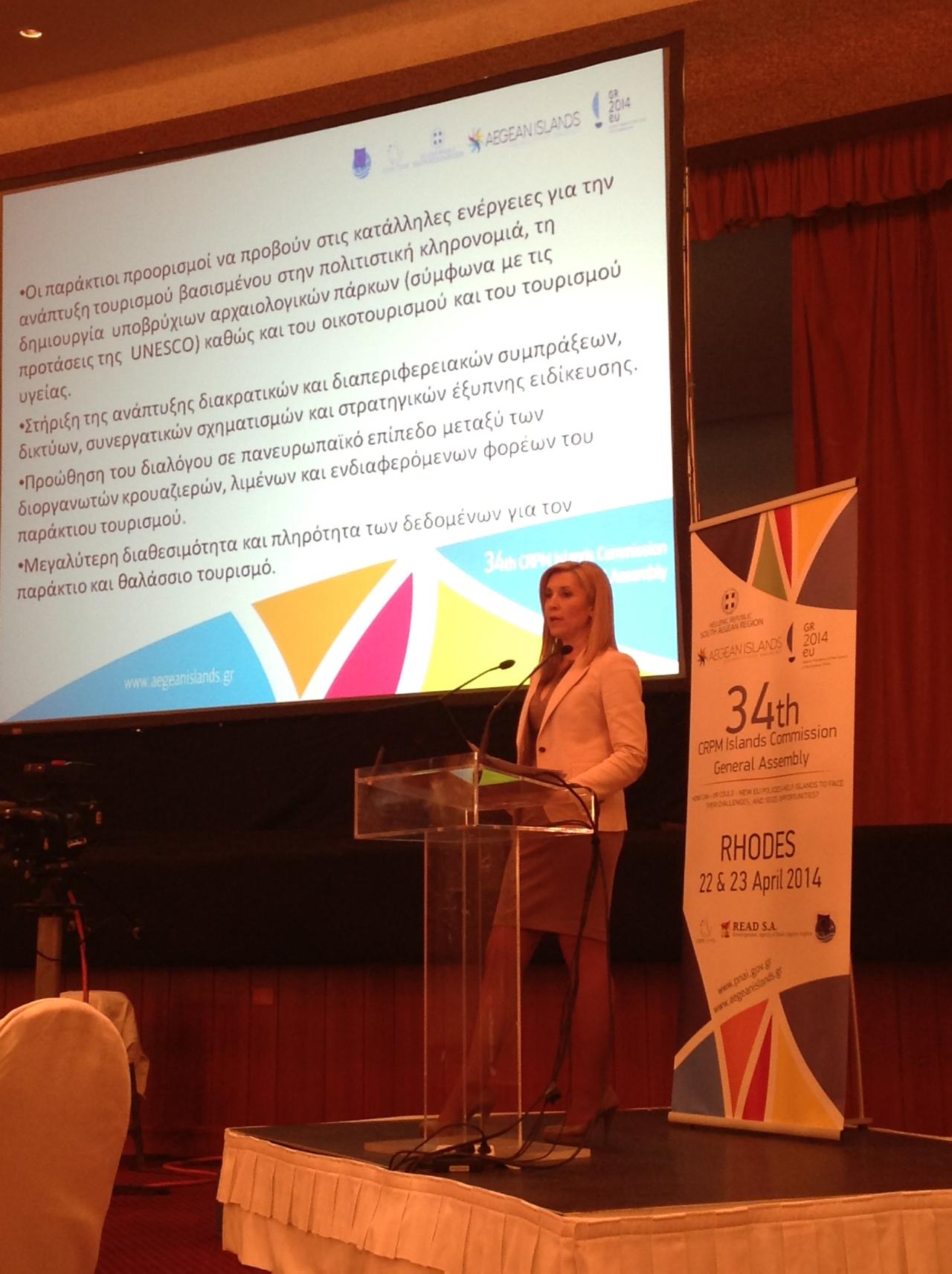 Για τις προκλήσεις και τις ευκαιρίες του Παράκτιου και Θαλάσσιου Τουρισμού στην Ευρωπαϊκή ΄Ενωση μίλησε η Αντιπεριφερειάρχης Νοτίου Αιγαίου Ελευθερία Φτακλάκη στην 4η συνεδρίαση της Γενικής Συνέλευσης Επιτροπής Νησιών της CRPM το απόγευμα της Τετάρτης 23 Απριλίου στο Rodos Palace.
