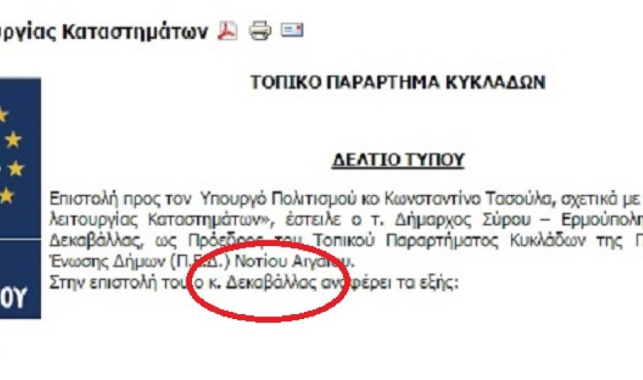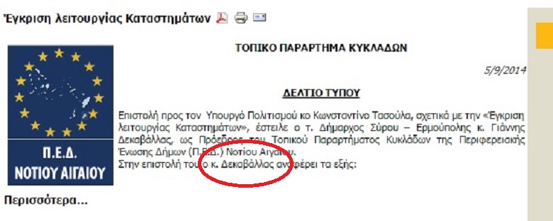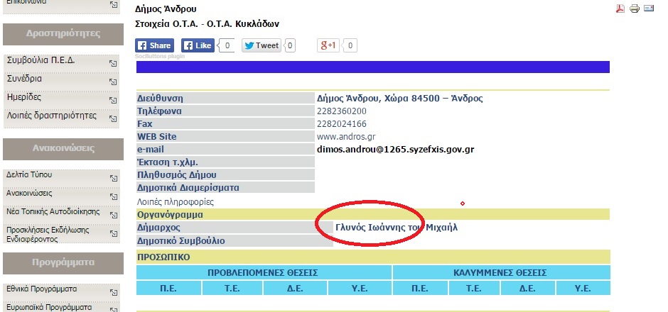 Συγκεκριμένα, μία απλή επίσκεψη στην συγκεκριμένη ιστοσελίδα αρκεί προκειμένου να διαπιστώσει κάποιος ότι το Συλλογικό Όργανο των Δήμων σε περιφερειακό επίπεδο διαθέτει το σύνολο των στοιχείων που αφορούν σε όλους του ΟΤΑ της προηγούμενης θητείας, δηλαδή της πρώτης “Καλλικρατικής” θητείας, στην οποία πρόεδρος υπήρξε ο π. Δήμαρχος Ρόδου, Στάθης Κουσουρνάς και αντιπρόεδρος και πρόεδρος του Τοπικού Παραρτήματος Κυκλάδων, ο π. Δήμαρχος Σύρου – Ερμούπολης, Γιάννης Δεκαβάλλας. Πλην των γενικών στοιχείων, όσον αφορά στους Δήμους των Κυκλάδων, γεγονός που επιβεβαιώνει τη στασιμότητα που επικρατεί όσον αφορά στη μη επικαιροποίησή της, είναι το όνομα του π. Δημάρχου Άνδρου, Γιάννη Γλυνού, η θητεία του οποίου έληξε μετά τις δημοτικές εκλογές, με την ανάληψη των καθηκόντων από τον Θεοδόση Σουσούδη.